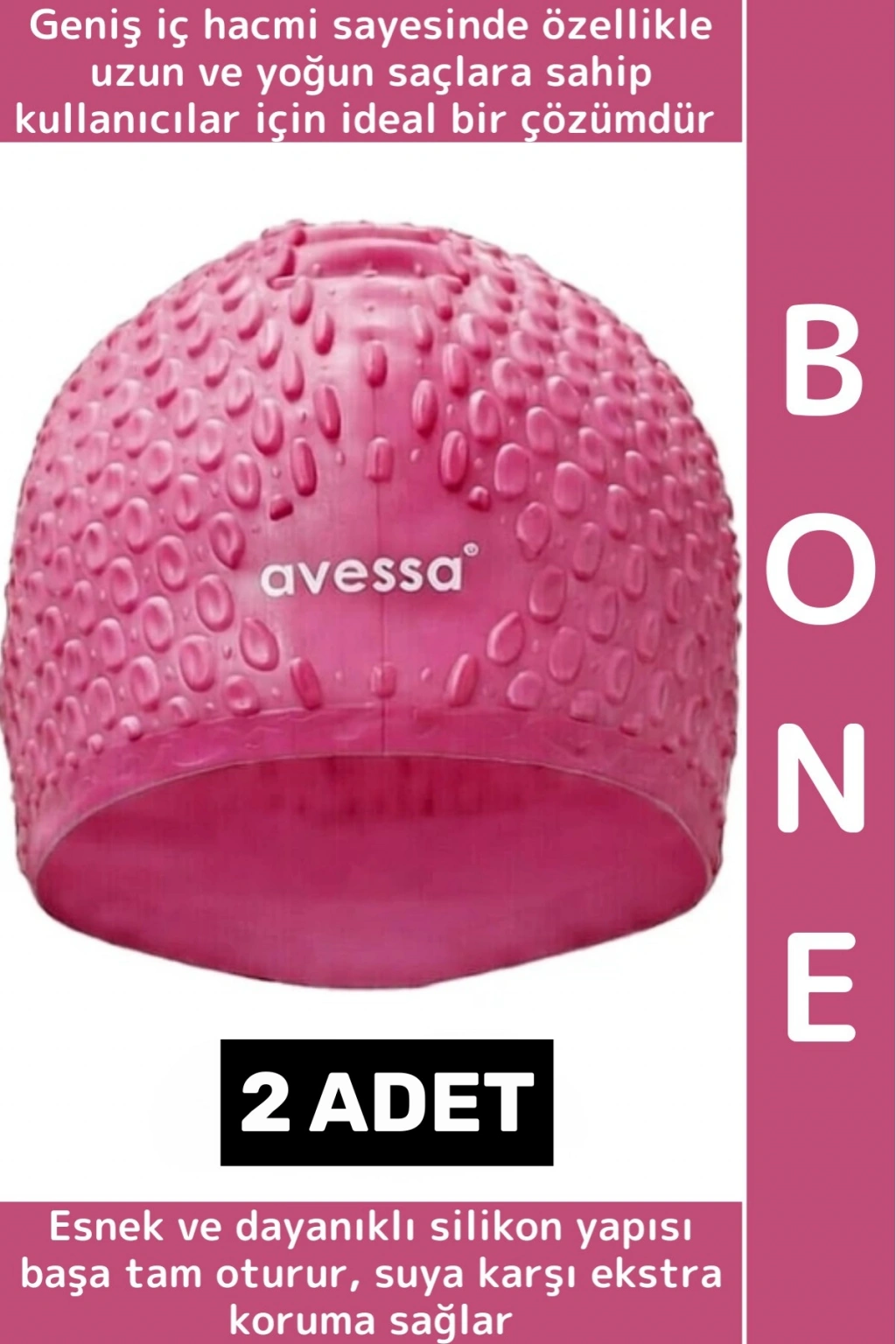 Yüzme antrenmanları ve düzenli havuz kullanımı için tasarlananBüyük Silikon Bone, geniş iç hacmi sayesinde özellikle uzun ve yoğun saçlara sahip kullanıcılar için ideal bir çözümdür. Esnek ve dayanıklı silikon yapısı başa tam oturur, suya karşı ekstra koruma sağlar.