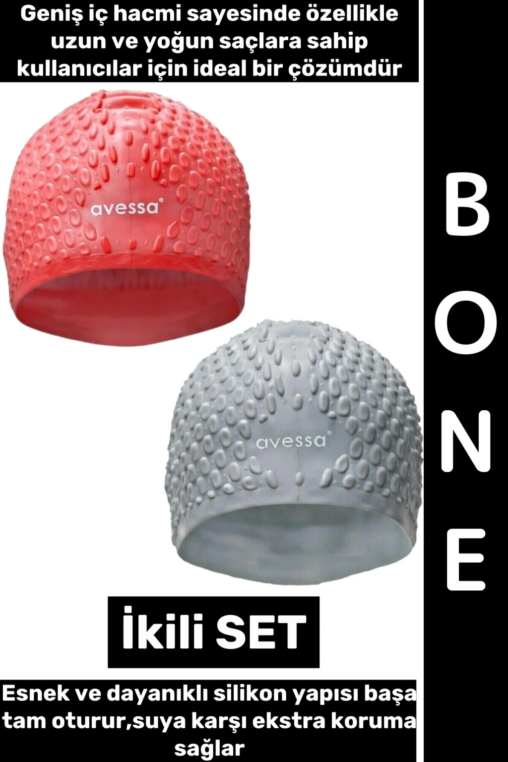 Yüzme antrenmanları ve düzenli havuz kullanımı için tasarlananBüyük Silikon Bone, geniş iç hacmi sayesinde özellikle uzun ve yoğun saçlara sahip kullanıcılar için ideal bir çözümdür. Esnek ve dayanıklı silikon yapısı başa tam oturur, suya karşı ekstra koruma sağlar.