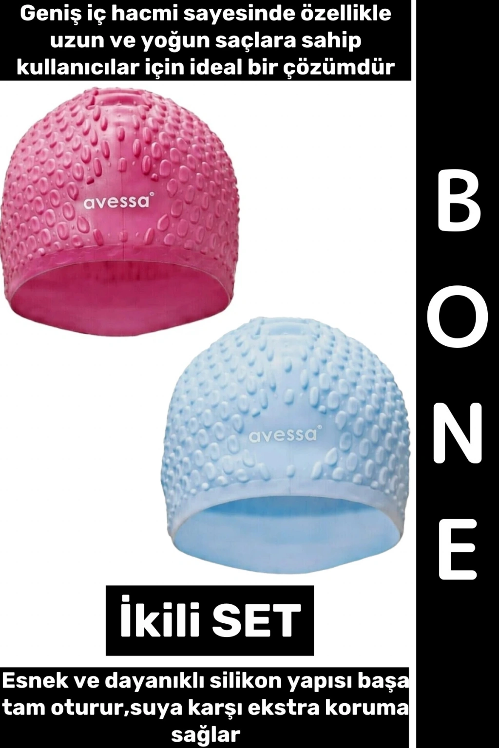 Yüzme antrenmanları ve düzenli havuz kullanımı için tasarlananBüyük Silikon Bone, geniş iç hacmi sayesinde özellikle uzun ve yoğun saçlara sahip kullanıcılar için ideal bir çözümdür. Esnek ve dayanıklı silikon yapısı başa tam oturur, suya karşı ekstra koruma sağlar.