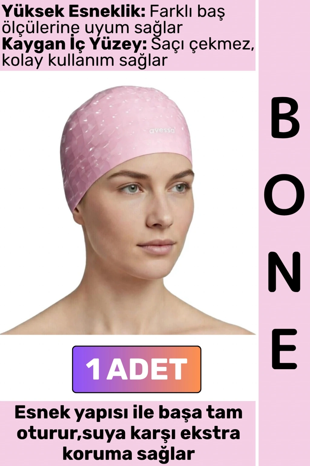Havuz ve deniz kullanımına uygun olarak tasarlanan bu boneler, esnek ve dayanıklı yapısıyla saçlarınızı sudan korurken konforlu bir kullanım sunar. Kaygan ve pürüzsüz yüzeyi sayesinde kolayca takılıp çıkarılabilir, saçı çekmez ve rahatsızlık vermez.