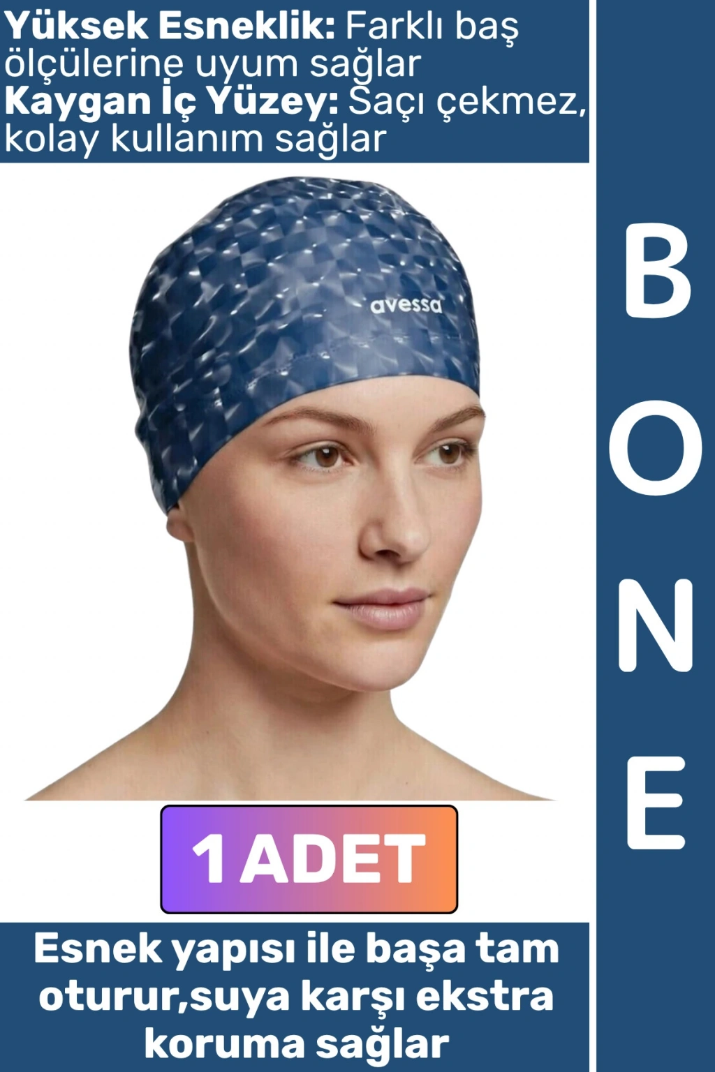 Havuz ve deniz kullanımına uygun olarak tasarlanan bu boneler, esnek ve dayanıklı yapısıyla saçlarınızı sudan korurken konforlu bir kullanım sunar. Kaygan ve pürüzsüz yüzeyi sayesinde kolayca takılıp çıkarılabilir, saçı çekmez ve rahatsızlık vermez.