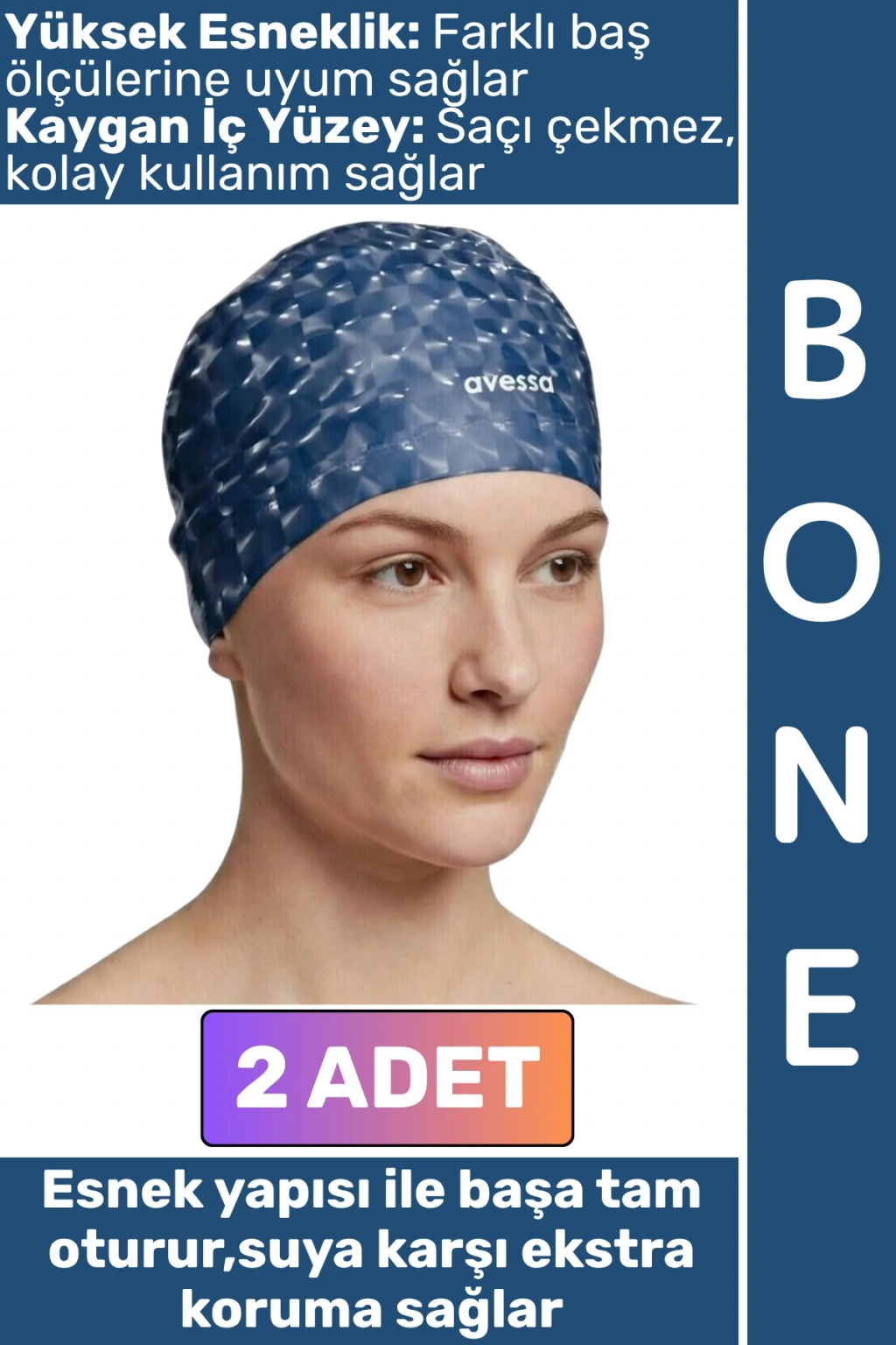 Havuz ve deniz kullanımına uygun olarak tasarlanan bu boneler, esnek ve dayanıklı yapısıyla saçlarınızı sudan korurken konforlu bir kullanım sunar. Kaygan ve pürüzsüz yüzeyi sayesinde kolayca takılıp çıkarılabilir, saçı çekmez ve rahatsızlık vermez.
