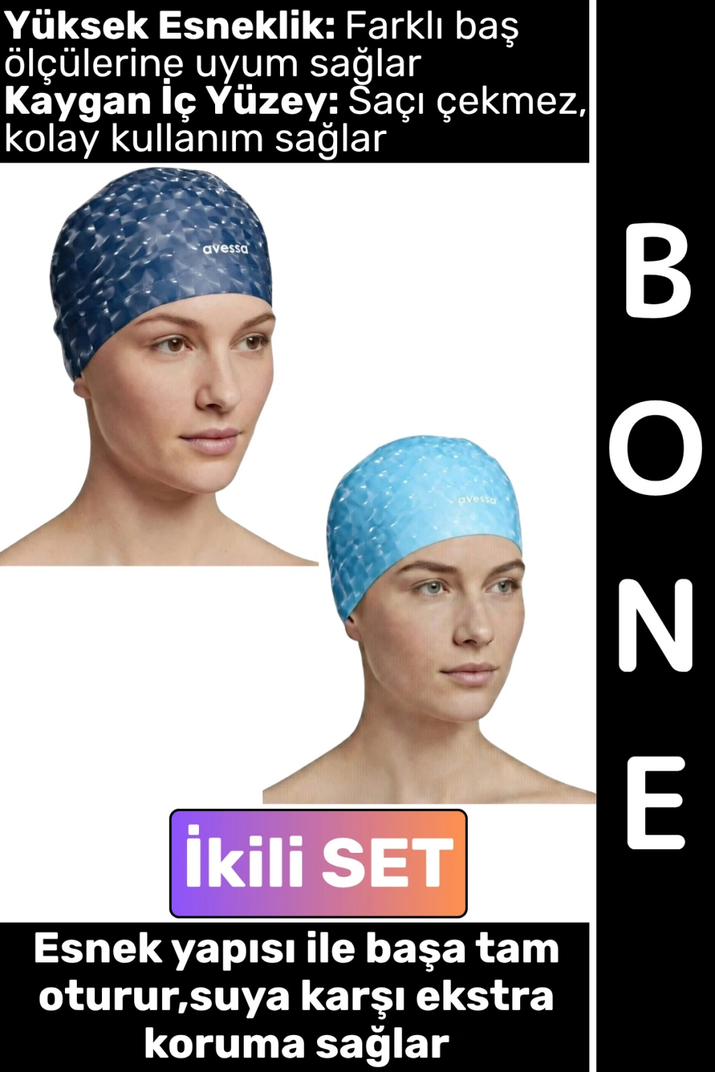 Havuz ve deniz kullanımına uygun olarak tasarlanan bu boneler, esnek ve dayanıklı yapısıyla saçlarınızı sudan korurken konforlu bir kullanım sunar. Kaygan ve pürüzsüz yüzeyi sayesinde kolayca takılıp çıkarılabilir, saçı çekmez ve rahatsızlık vermez.
