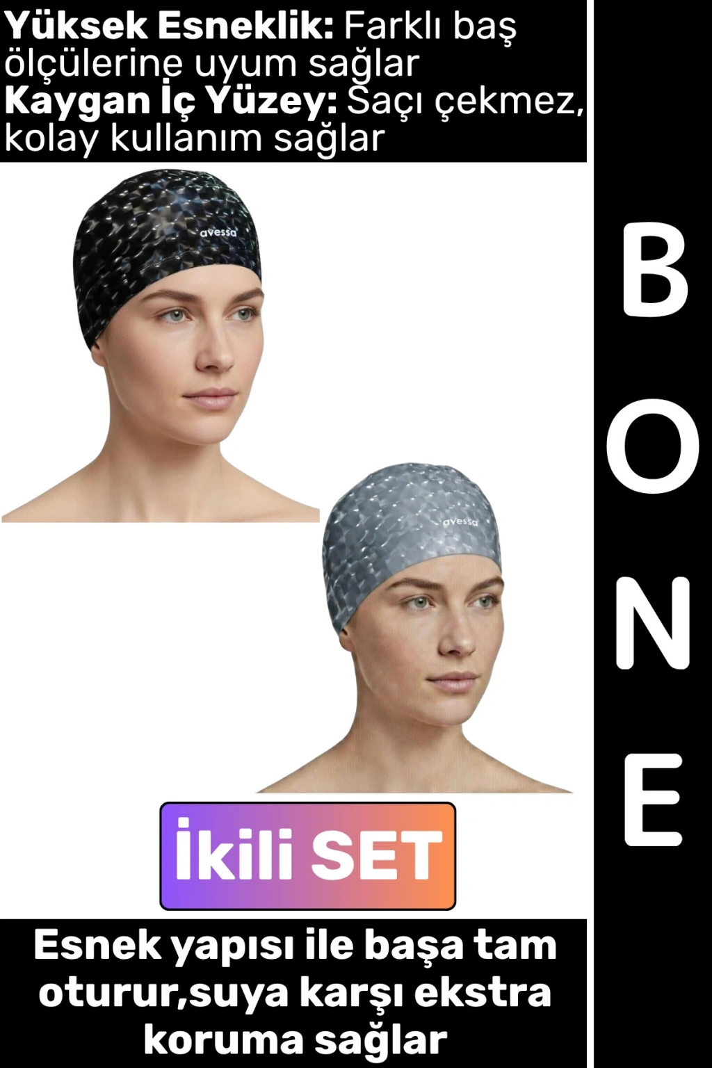 #Bone Konforlu Esnek Yumuşak Havuz Deniz Yüzme Kaygan İç Yüzey Şık Su Geçirmez Saç Bonesi İkili SET