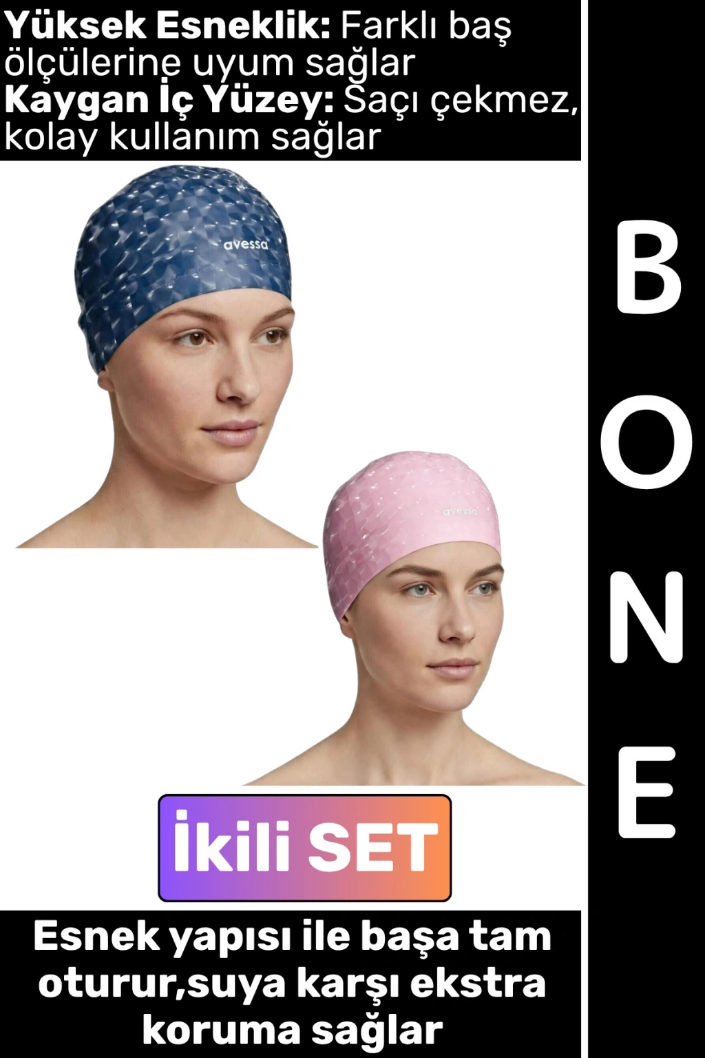 #Bone Konforlu Esnek Yumuşak Havuz Deniz Yüzme Kaygan İç Yüzey Şık Su Geçirmez Saç Bonesi İkili SET