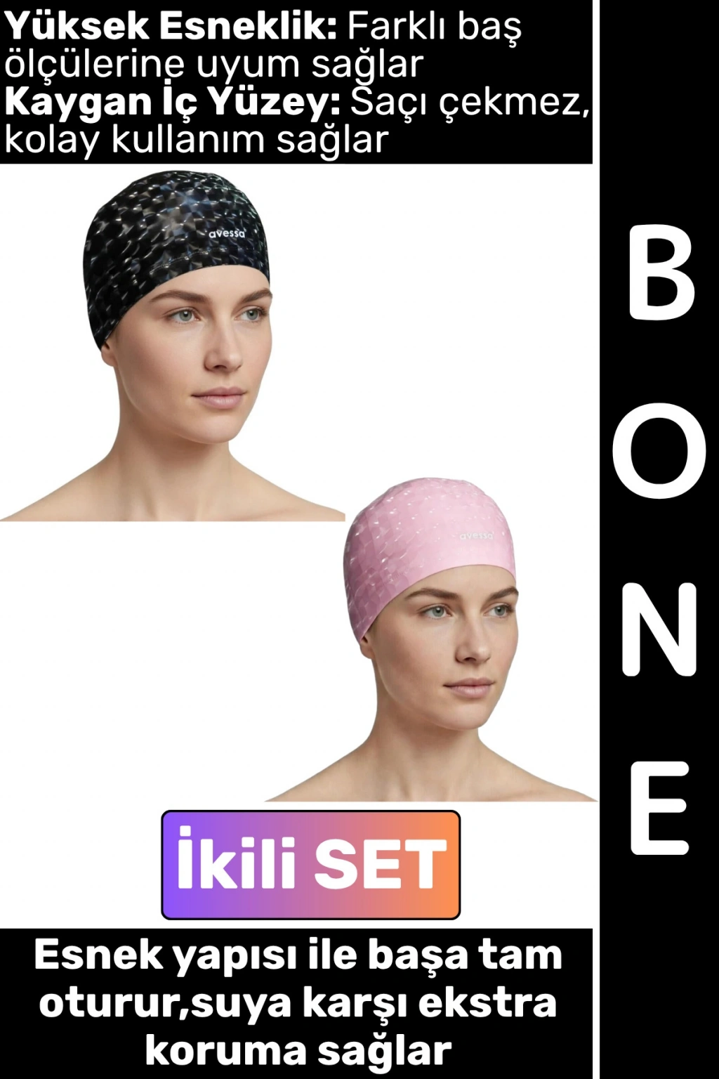 #Bone Konforlu Esnek Yumuşak Havuz Deniz Yüzme Kaygan İç Yüzey Şık Su Geçirmez Saç Bonesi İkili SET