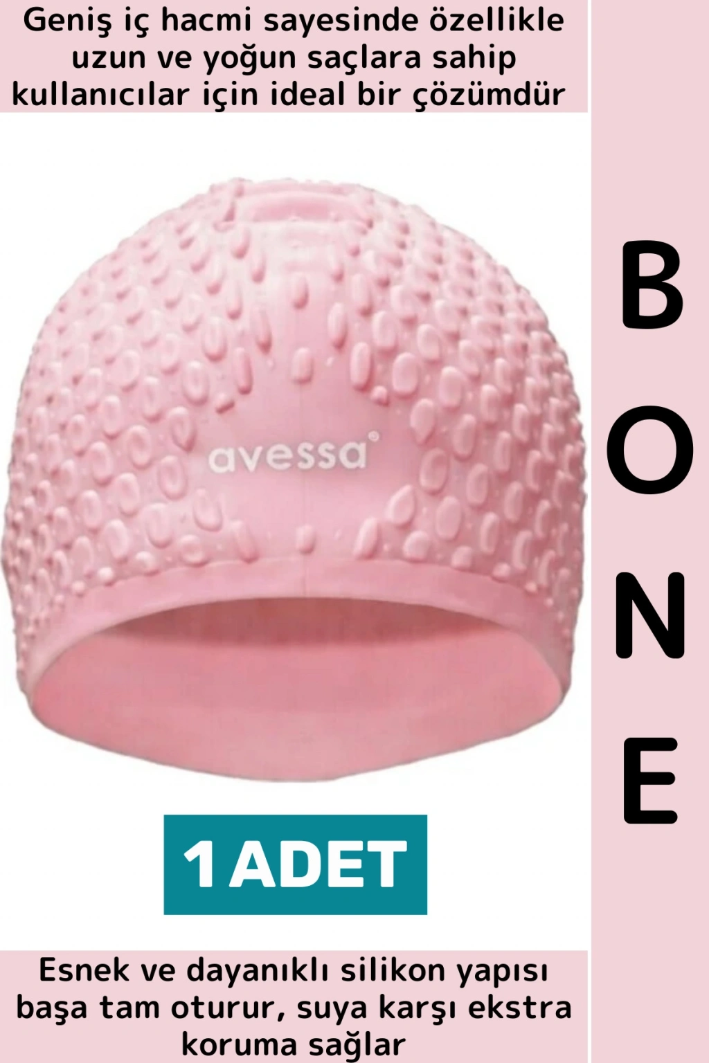 Yüzme antrenmanları ve düzenli havuz kullanımı için tasarlananBüyük Silikon Bone, geniş iç hacmi sayesinde özellikle uzun ve yoğun saçlara sahip kullanıcılar için ideal bir çözümdür. Esnek ve dayanıklı silikon yapısı başa tam oturur, suya karşı ekstra koruma sağlar.