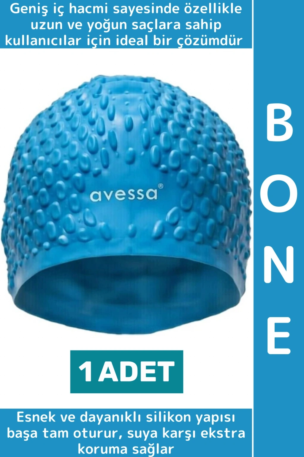 Yüzme antrenmanları ve düzenli havuz kullanımı için tasarlananBüyük Silikon Bone, geniş iç hacmi sayesinde özellikle uzun ve yoğun saçlara sahip kullanıcılar için ideal bir çözümdür. Esnek ve dayanıklı silikon yapısı başa tam oturur, suya karşı ekstra koruma sağlar.
