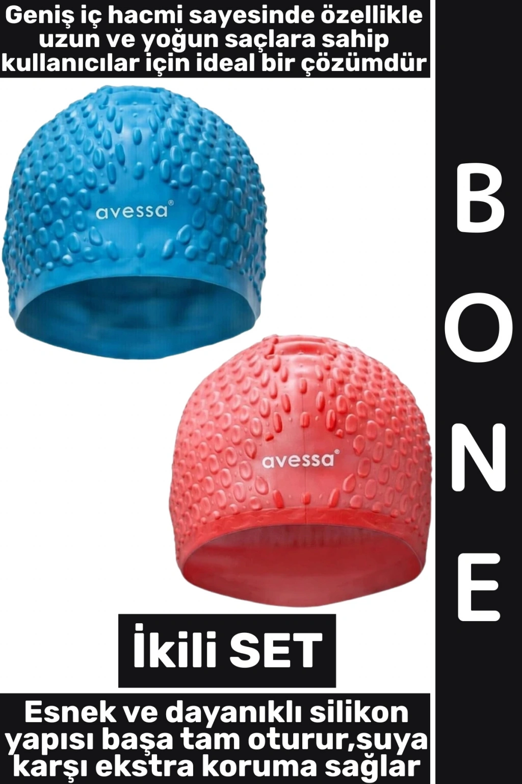 Yüzme antrenmanları ve düzenli havuz kullanımı için tasarlanan Büyük Silikon Bone, geniş iç hacmi sayesinde özellikle kadınlar ve uzun,yoğun saçlara sahip kullanıcılar için ideal bir çözüm sunar. Esnek ve dayanıklı silikon yapısı başa tam oturur, kulakları suya karşı ekstra korur.