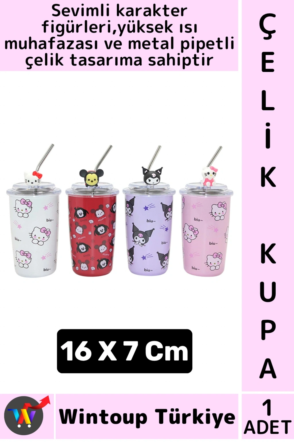 #ÇelikKupa Hediye Ev Ofis Isı Muhafazalı Çok Şık Sevimli Karakter Figürlü Metal Pipetli Çelik Kupa