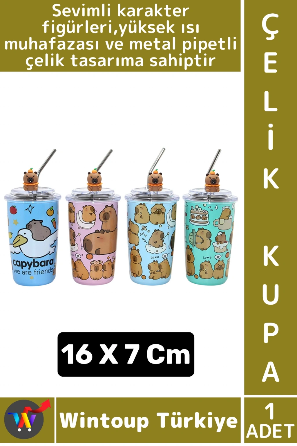 #ÇelikKupa Hediye Ev Ofis Isı Muhafazalı Çok Şık Sevimli Karakter Figürlü Metal Pipetli Çelik Kupa