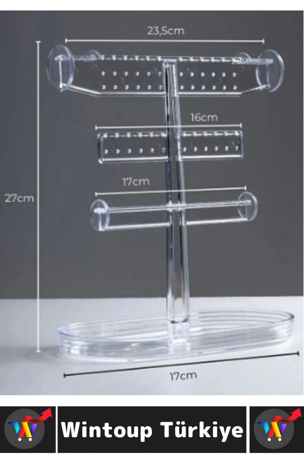 Aksesuar standı takı organizer, şık ve fonksiyonel tasarımıyla küpe, kolye, bileklik ve yüzüklerinizi düzenli bir şekilde sergilemenizi sağlar. 23,5 cm üst genişlik, 16 cm orta kısım ve 17 cm alt genişliği ile farklı boyutlardaki takılar için ideal kullanım sunar. Toplam yüksekliği 27 cm olan bu stand, şeffaf ve dayanıklı plastikten üretilmiştir. Hem evde hem de mağaza vitrinlerinde kullanılabilir. Takılarınızın dolaşmasını önler ve düzenli bir görünüm elde etmenizi sağlar.