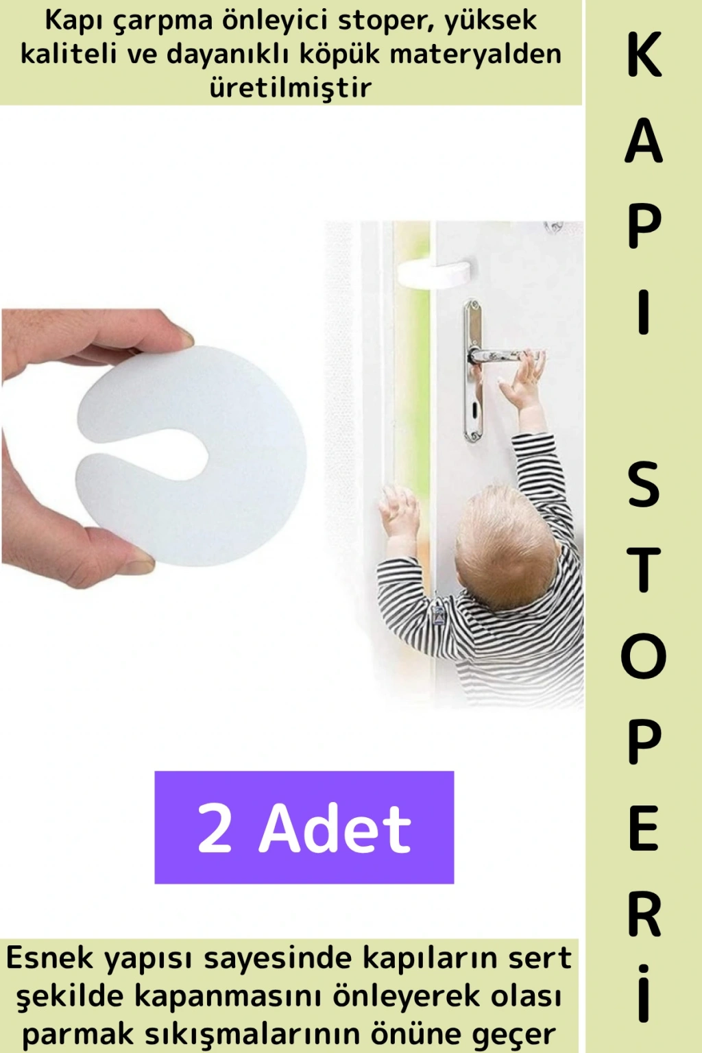 Kapı çarpma önleyici stoper, yüksek kaliteli ve dayanıklı köpük materyalden üretilmiştir. Esnek yapısı sayesinde kapıların sert şekilde kapanmasını önleyerek olası parmak sıkışmalarının önüne geçer. Dolap, çekmece, kapı gibi çeşitli yüzeylerde kullanılabilir.