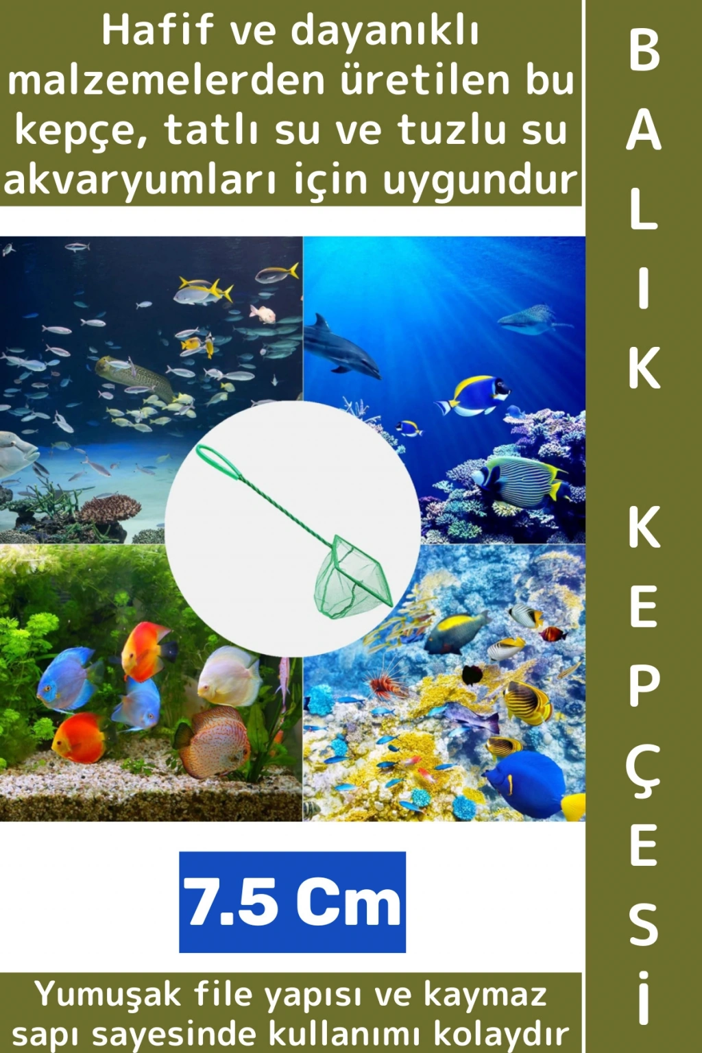 Akvaryum Balık Yakalama Kepçesi, balıklarınıza zarar vermeden güvenli bir şekilde yakalamanız için özel olarak tasarlanmıştır. Yumuşak file yapısı ve kaymaz sapı sayesinde kullanımı kolaydır. Hafif ve dayanıklı malzemelerden üretilen bu kepçe, tatlı su ve tuzlu su akvaryumları için uygundur. Mikro teknoloji ile örülmüş kumaş özellikli.