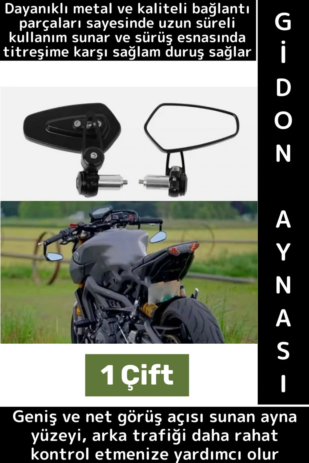 Dayanıklı metal ve kaliteli bağlantı parçaları sayesinde uzun süreli kullanım sunar ve sürüş esnasında titreşime karşı sağlam duruş sağlar. Gidon uçlarına kolayca monte edilebilen yapısı sayesinde ek aparat veya karmaşık montaj işlemlerine ihtiyaç duyulmaz. Geniş ve net görüş açısı sunan ayna yüzeyi, arka trafiği daha rahat kontrol etmenize yardımcı olarak sürüş güvenliğini artırır.