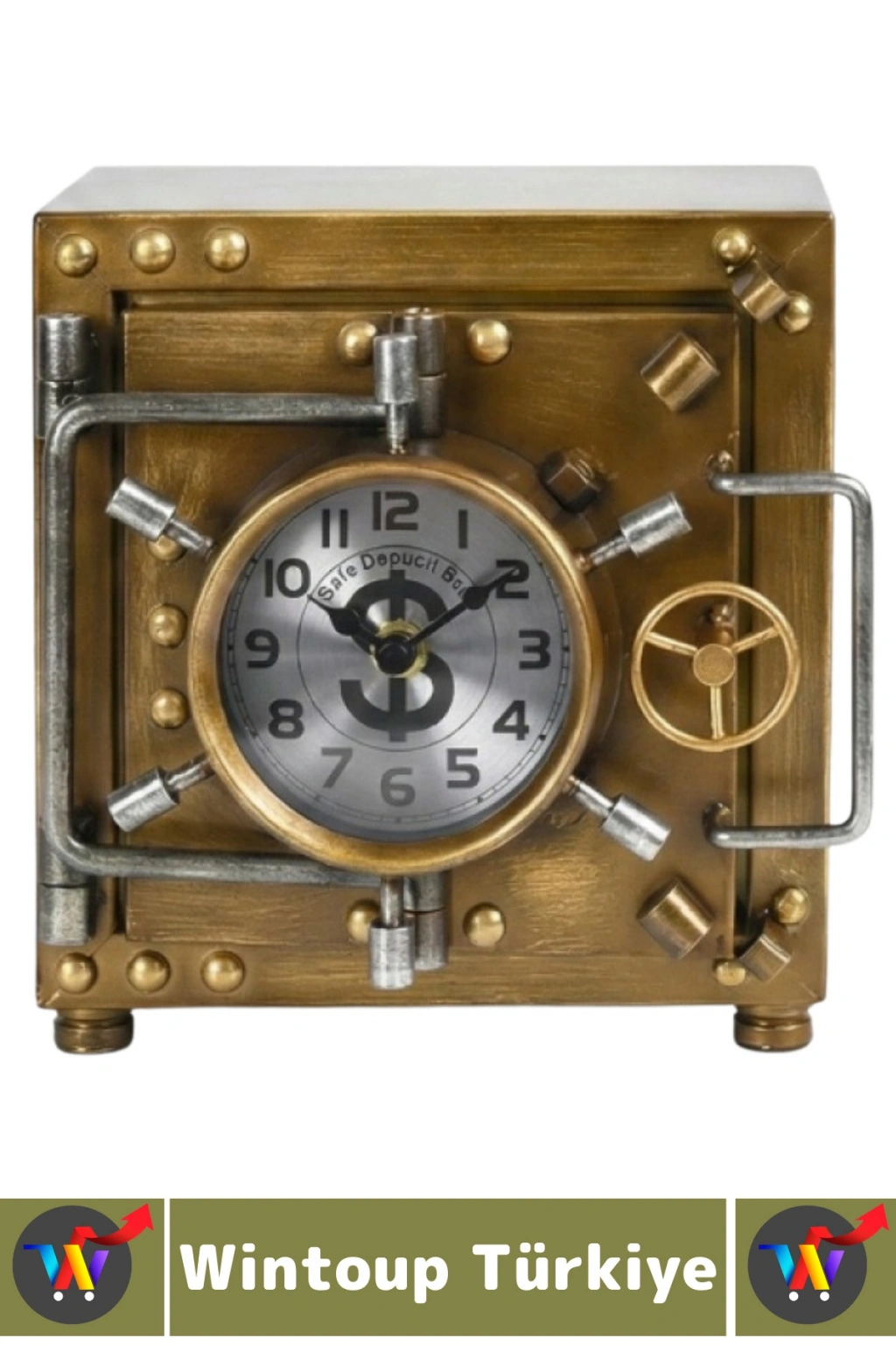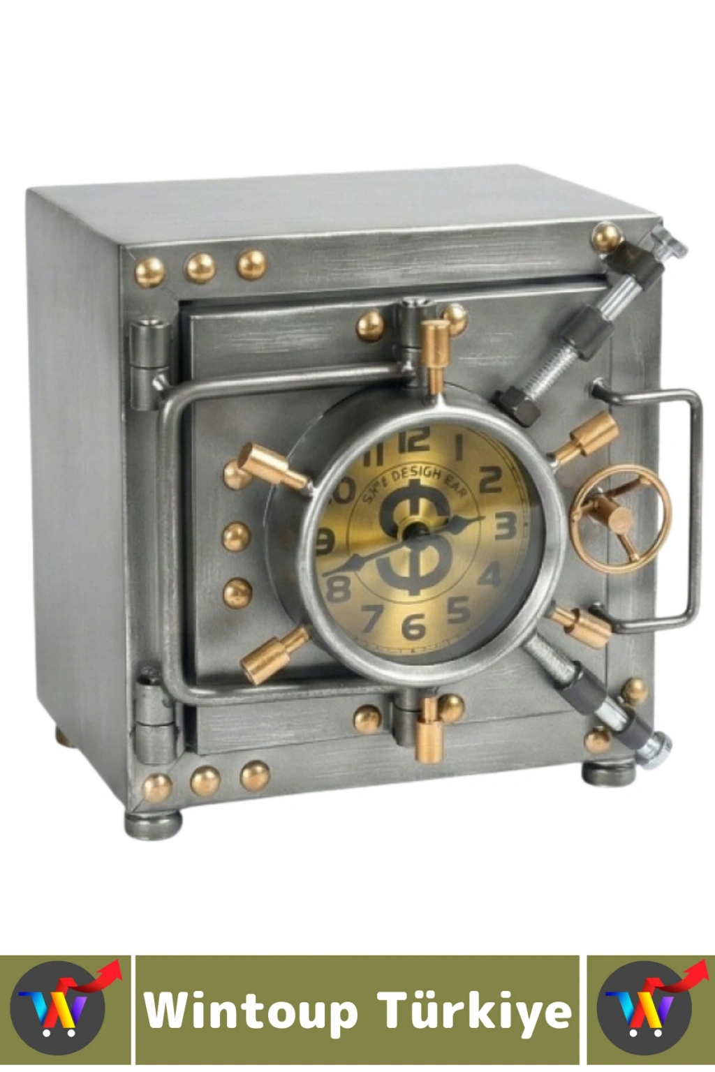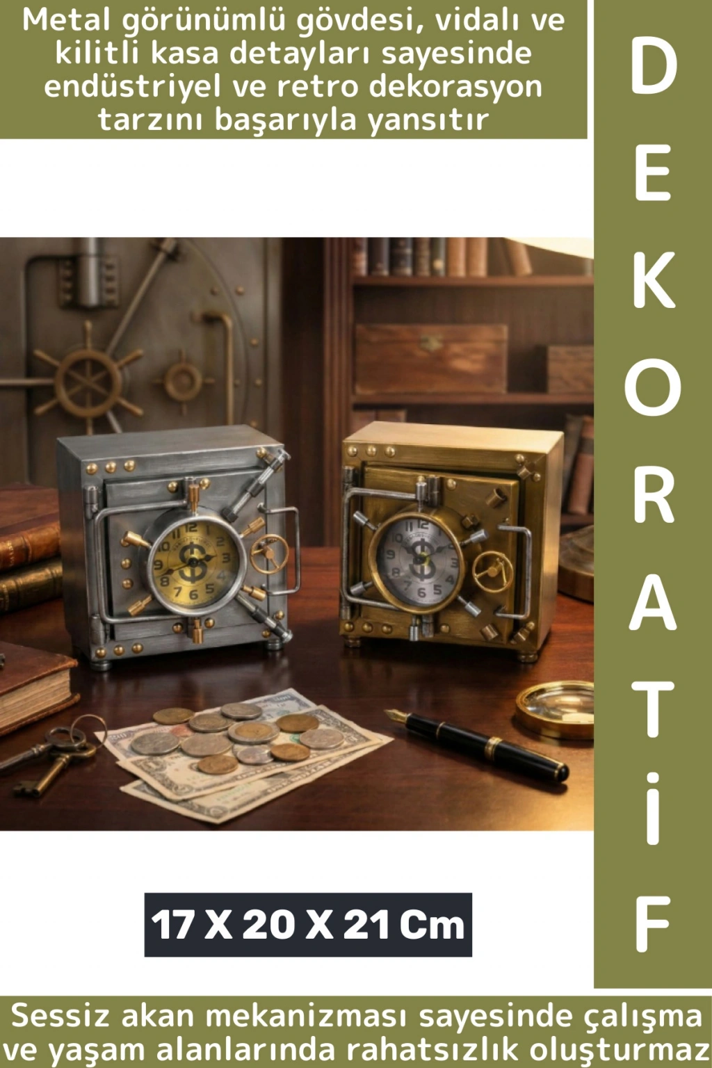 Kasa tasarımlı masaüstü saat, klasik kasa kapaklarından ilham alan detaylı ve özgün görünümüyle dekoratif saat kategorisinde öne çıkan özel bir modeldir. Metal görünümlü gövdesi, vidalı ve kilitli kasa detayları sayesinde endüstriyel ve retro dekorasyon tarzını başarıyla yansıtır.