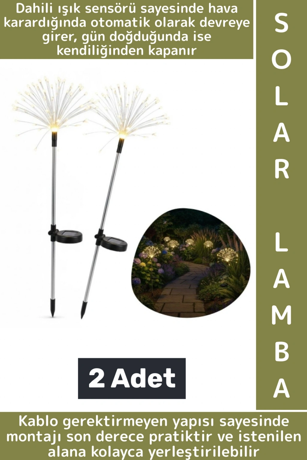 Kablo gerektirmeyen yapısı sayesinde montajı son derece pratiktir ve istenilen alana kolayca yerleştirilebilir. Bahçe peyzajı, balkon dekorasyonu, teras aydınlatması, çit ve yürüyüş yolu kenarları için hem dekoratif hem de güvenli bir aydınlatma alternatifi sunar.