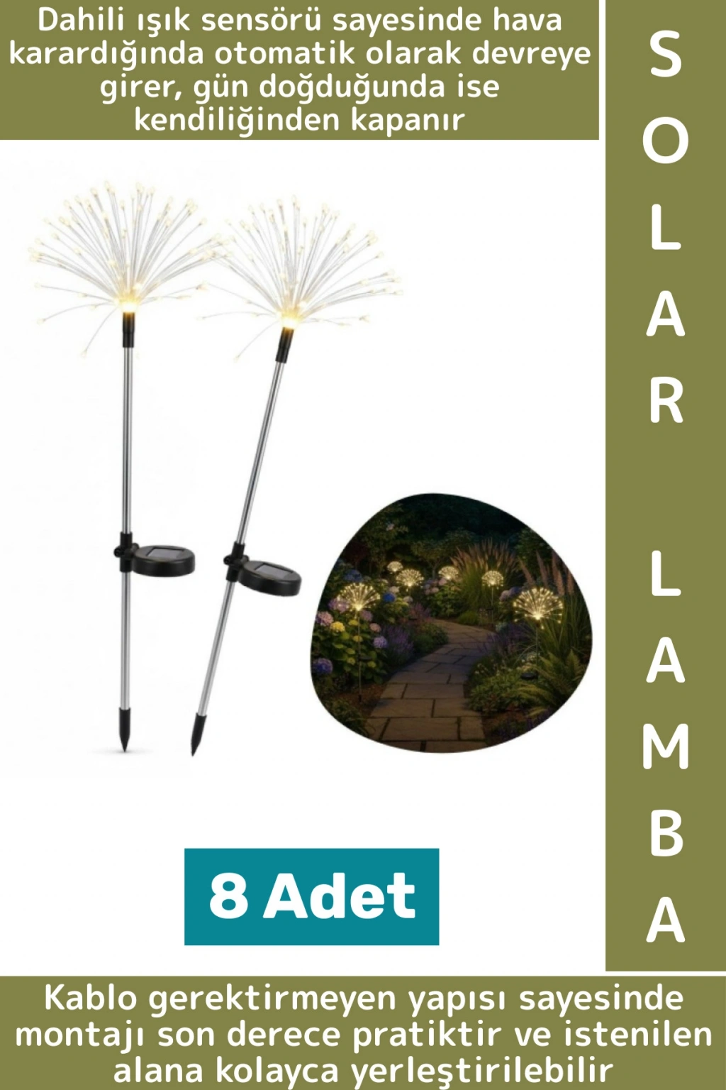 Kablo gerektirmeyen yapısı sayesinde montajı son derece pratiktir ve istenilen alana kolayca yerleştirilebilir. Bahçe peyzajı, balkon dekorasyonu, teras aydınlatması, çit ve yürüyüş yolu kenarları için hem dekoratif hem de güvenli bir aydınlatma alternatifi sunar.