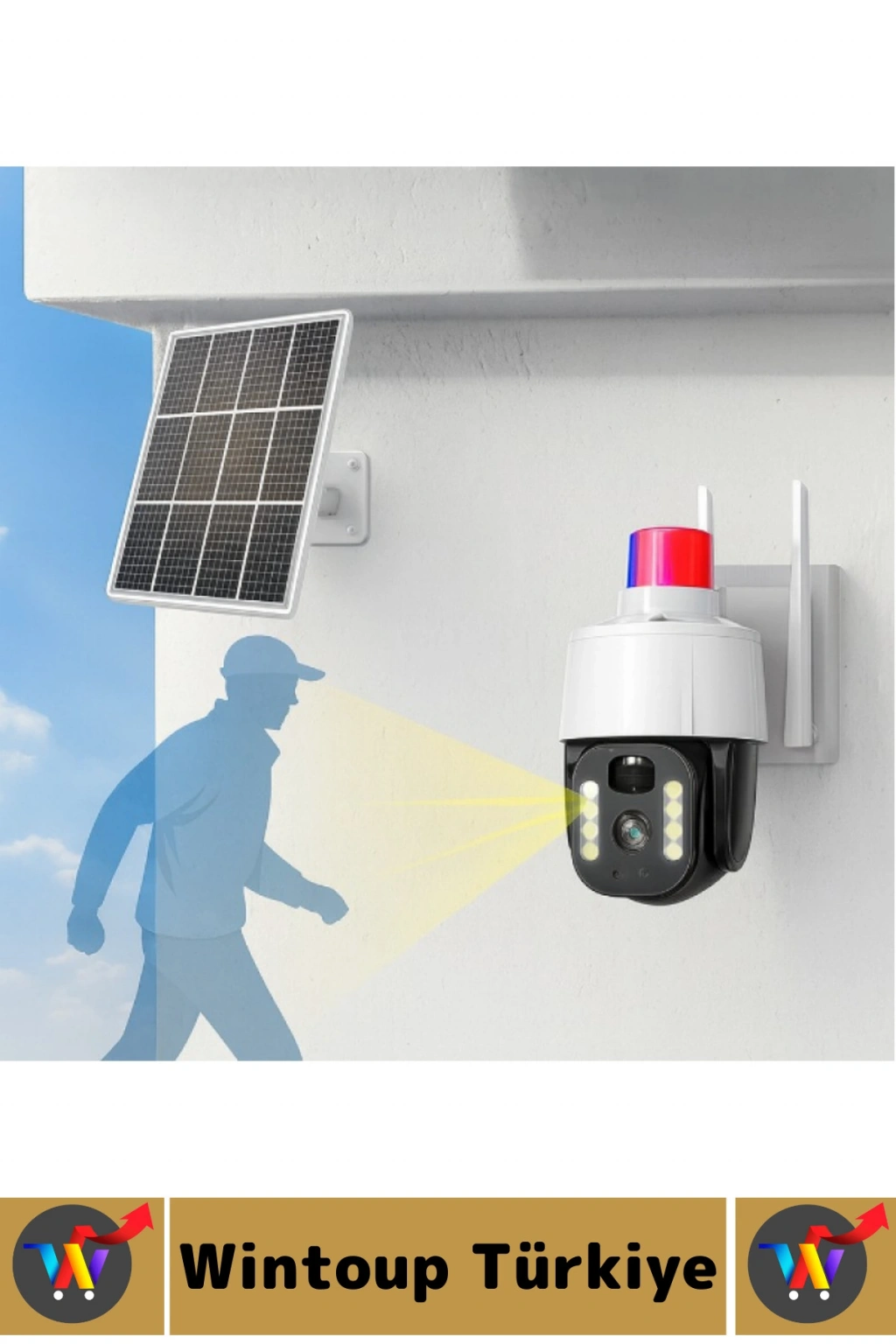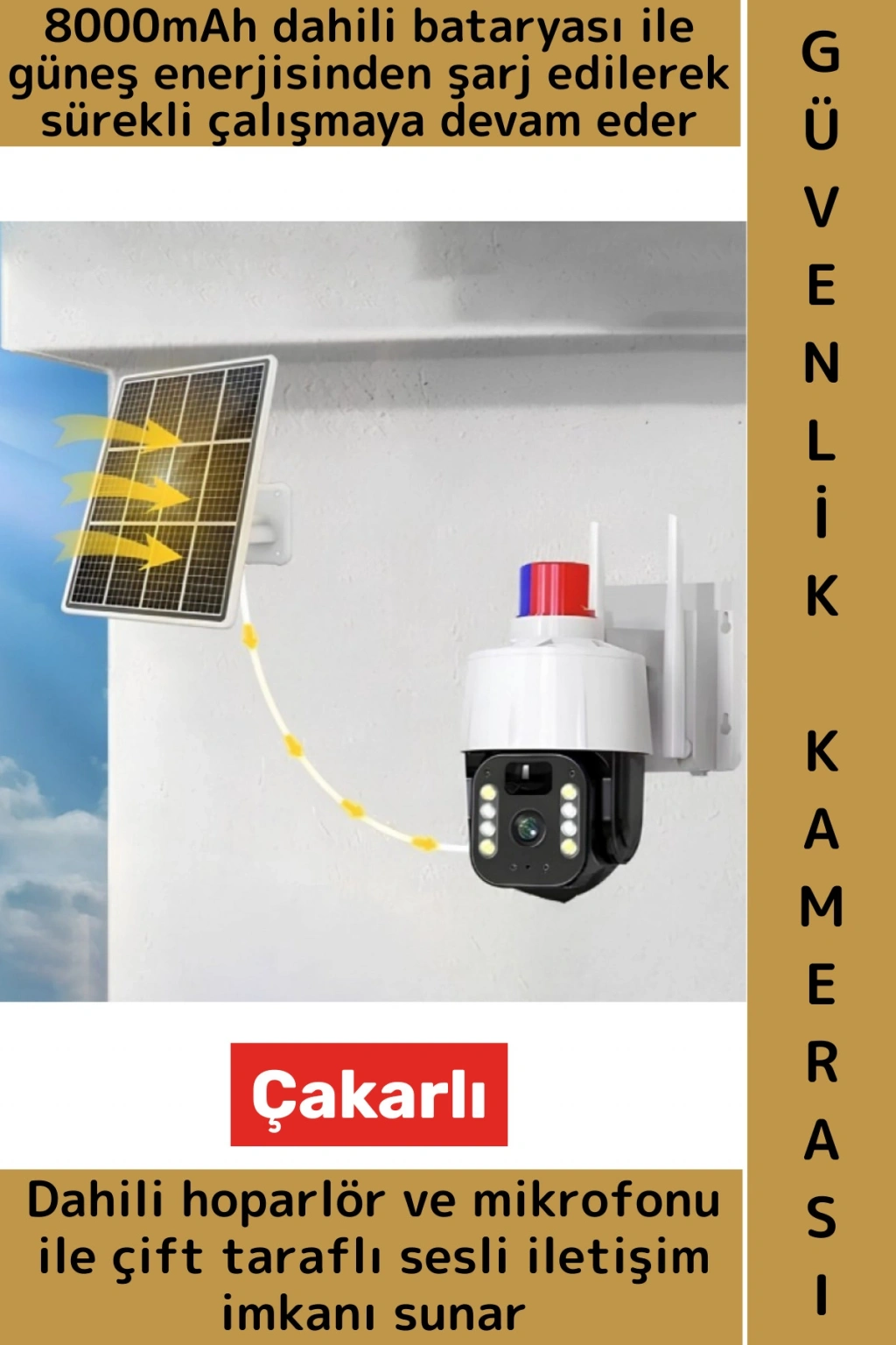 GÜNEŞ ENERJİLİ ALARMLI ÇAKARLI DIŞ MEKAN GÜVENLİK KAMERASI