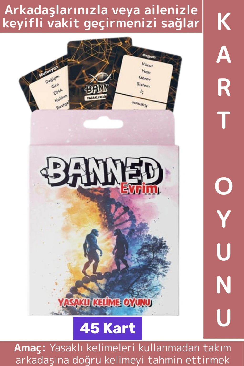 Banned Evrim Kart Oyunu, yasaklı kelime mantığıyla oynanan eğlenceli ve öğretici bir parti oyunudur. Toplamda 45 kart ve 180 kelime içerir; zorluk seviyesi ise seriler arasında en yüksek olanıdır