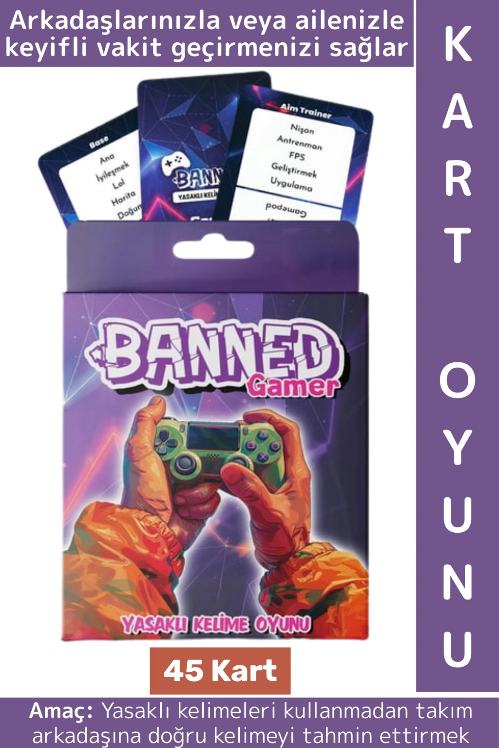 Banned Gamer Kart Oyunu toplamda 45 kart ve 180 kelimeden oluşur. Oyun, video oyun kültürüne özel hazırlanmış yasaklı kelime kartlarıyla oynanır ve oyuncuların kelime dağarcığını, hızlı düşünme ve iletişim becerilerini geliştirmeyi amaçlar.