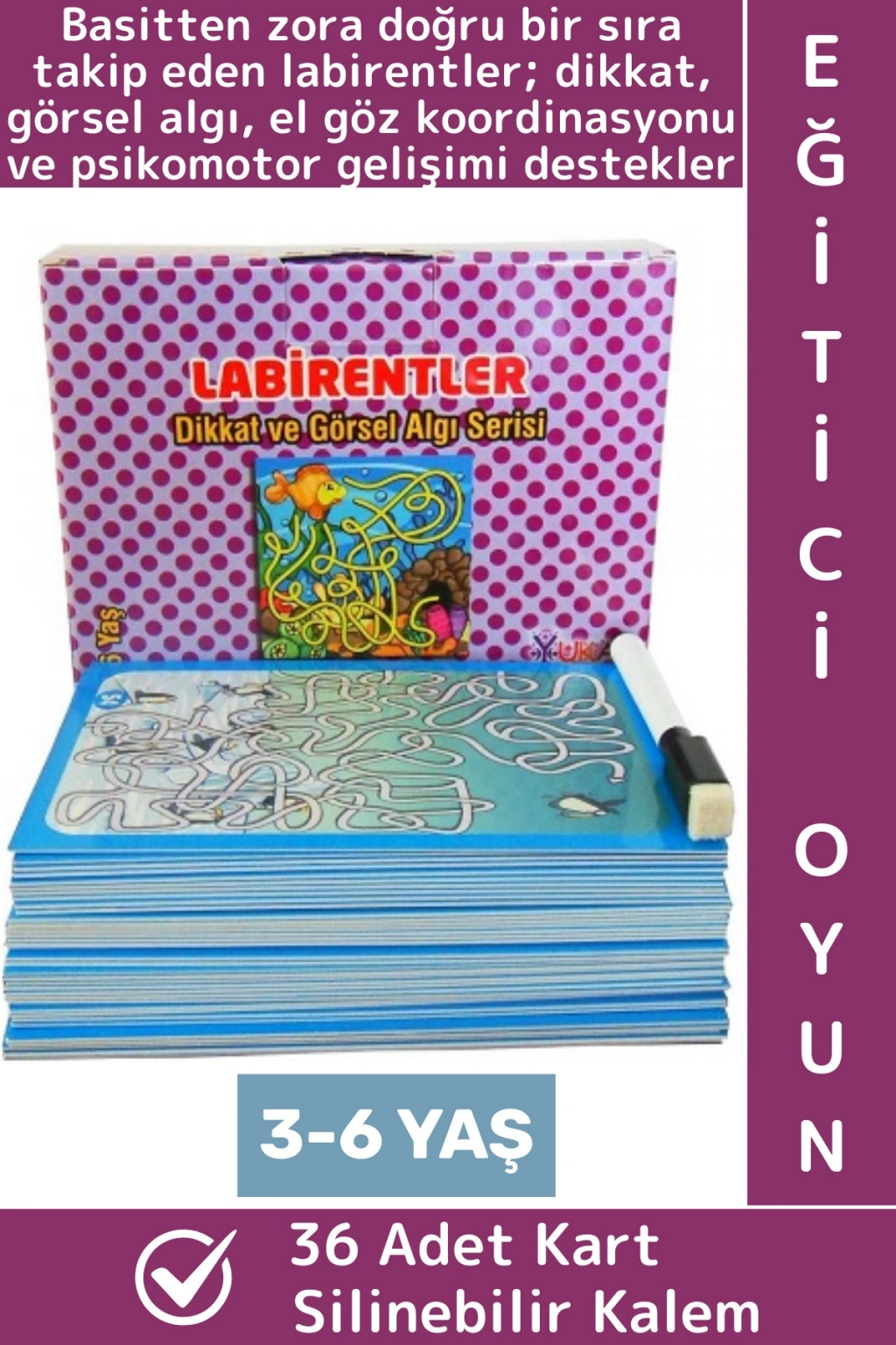 36 kart, 72 labirent ve silinebilir kalem.
