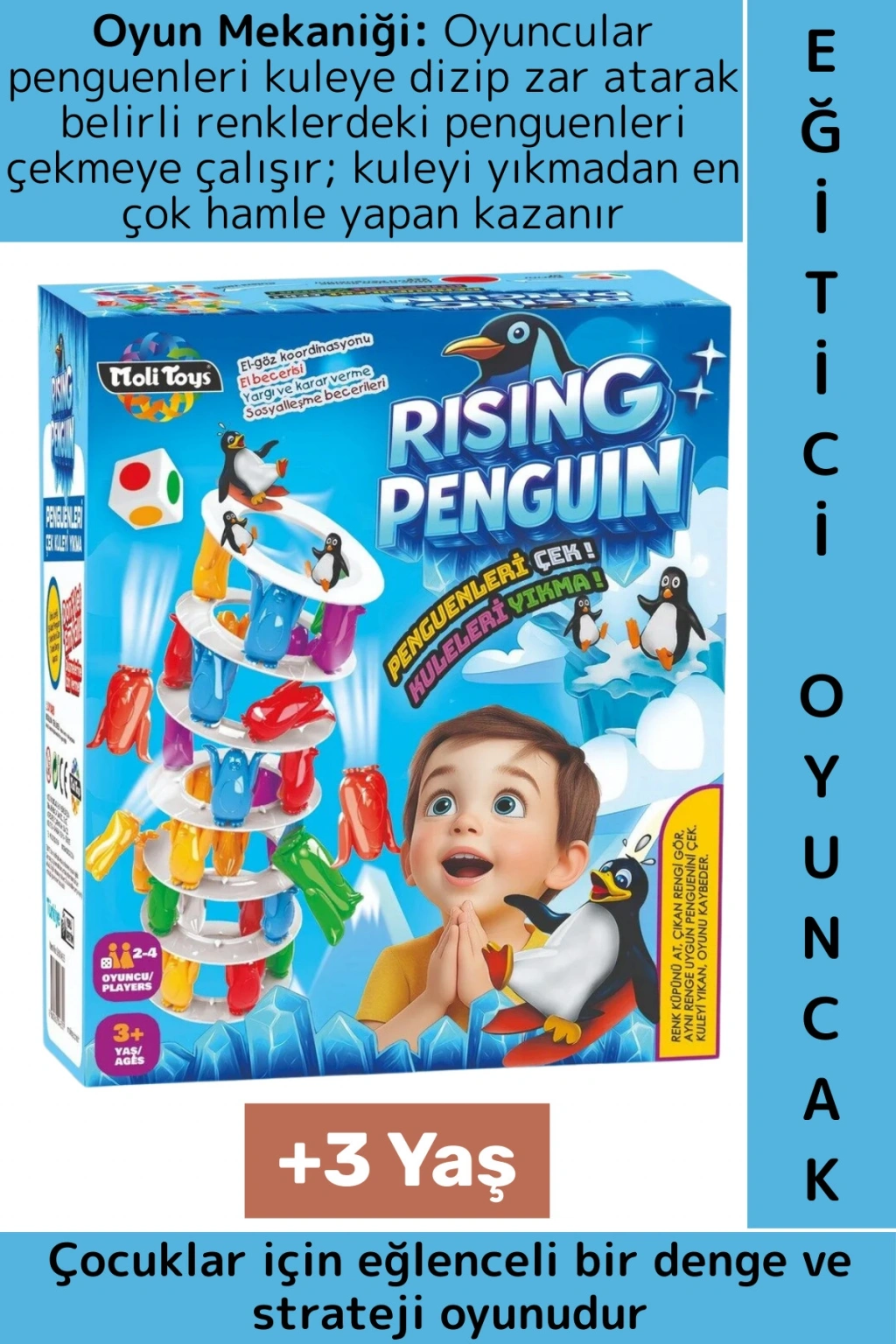 Rising Penguin oyunu, çocuklar için eğlenceli bir denge ve strateji oyunudur. Oyuncular penguenleri kuleye dizip zar atarak belirli renklerdeki penguenleri çekmeye çalışır; kuleyi yıkmadan en çok hamle yapan kazanır.