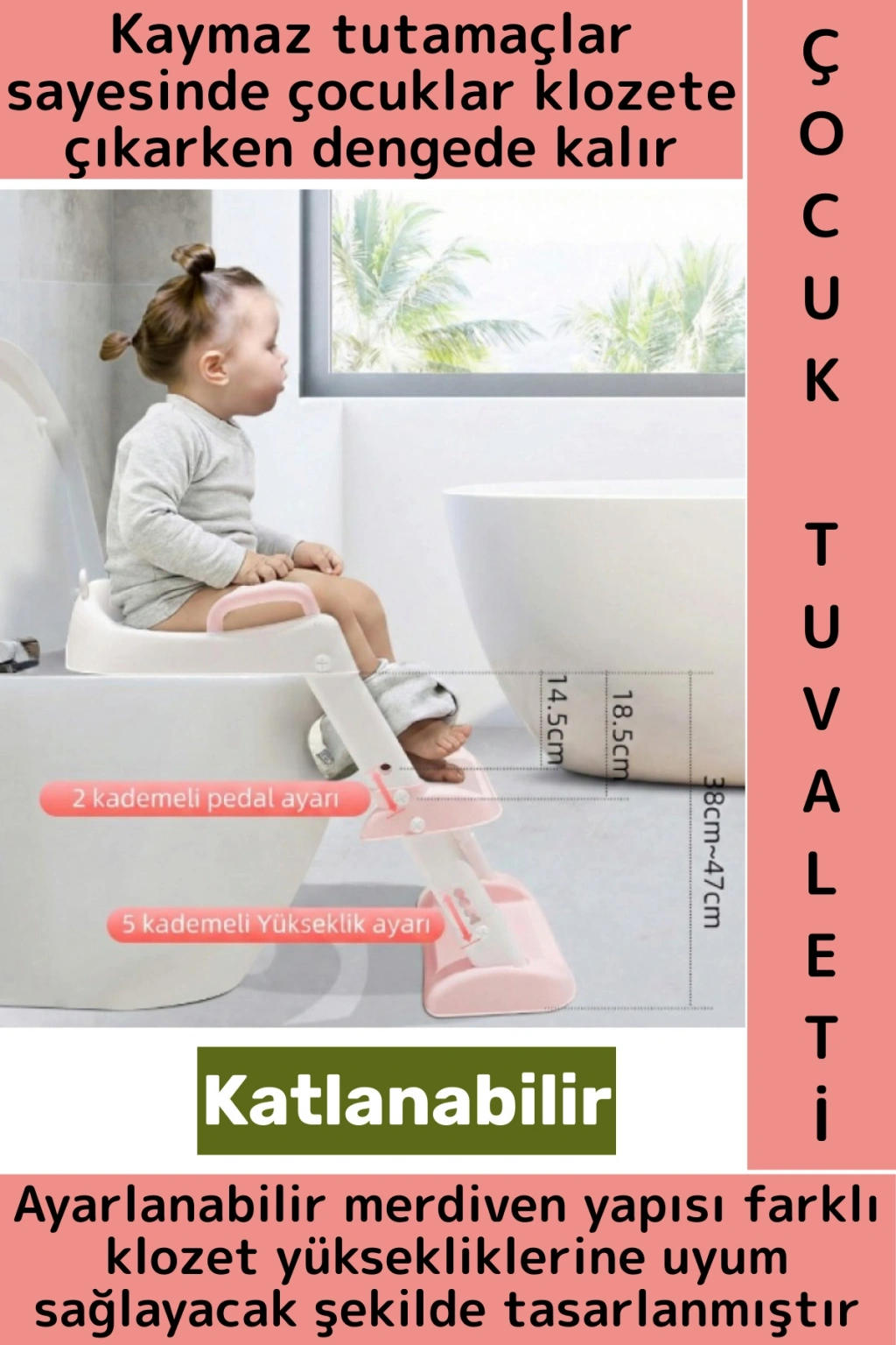 Kaymaz tutamaçlar sayesinde çocuklar klozete çıkarken dengede kalır ve ebeveyn desteğine ihtiyaç duymadan güvenle oturabilir. Alt kısmında yer alan kaymaz basamaklar, sağlam zemin tutuşu sağlayarak kayma riskini minimuma indirir.