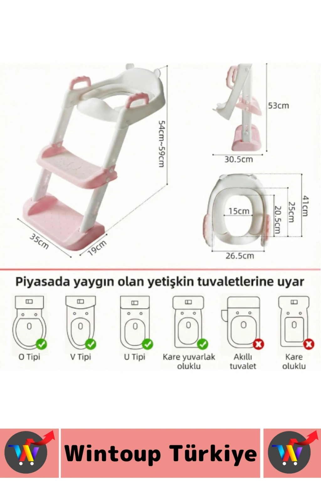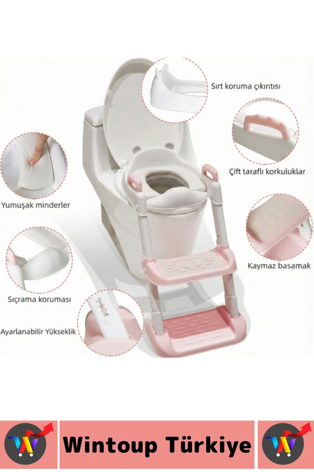 Sıçrama önleyici ön tasarım, tuvalet eğitimi sırasında hijyenin korunmasına yardımcı olurken, çıkarılabilir haznesi temizlik ve bakım kolaylığı sağlar. Ayarlanabilir merdiven yapısı farklı klozet yüksekliklerine uyum sağlayacak şekilde tasarlanmıştır ve çoğu standart klozet modeliyle rahatlıkla kullanılabilir. Dayanıklı ve kaliteli plastik malzemeden üretilmiş olan ürün, hafif yapısı sayesinde kolay taşınabilir ve kullanılmadığında pratik şekilde kaldırılabilir. Çocukların tuvaleti kendi başlarına kullanma alışkanlığı kazanmasını destekleyen bu aparat, ebeveynler için de süreci daha stressiz ve düzenli hale getirir.