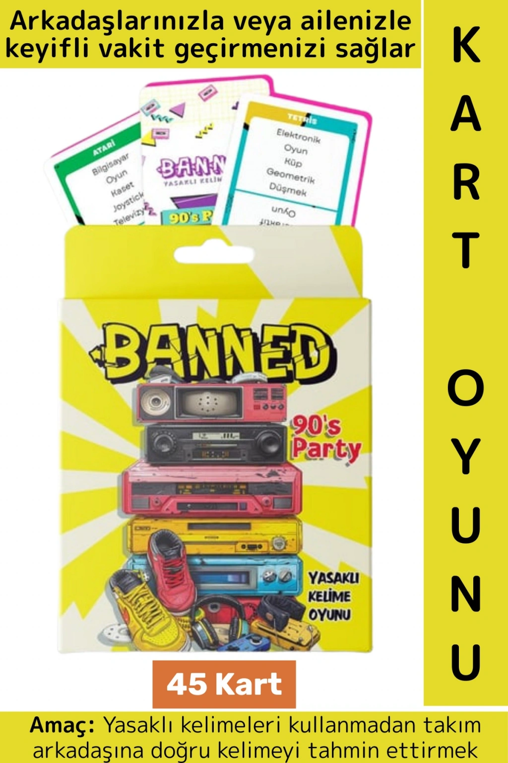 Banned 90’lar Kart Oyunu, nostalji temalı bir yasaklı kelime oyunudur ve toplamda 45 kart içerir. Her kartta bir anahtar kelime ve kullanılması yasak olan kelimeler bulunur.
