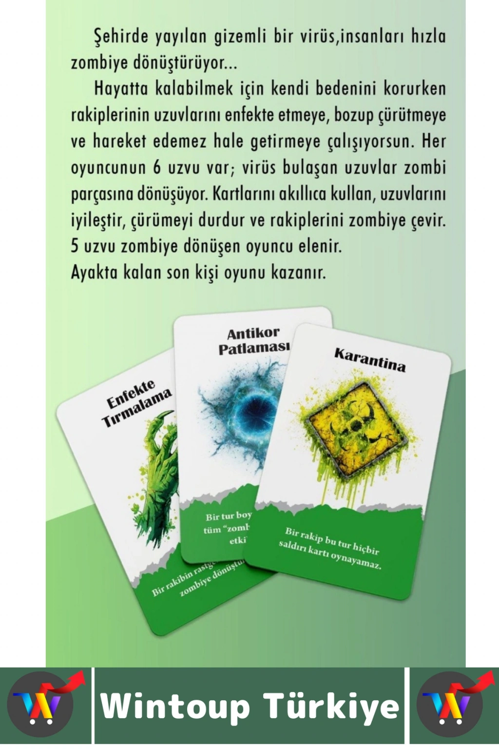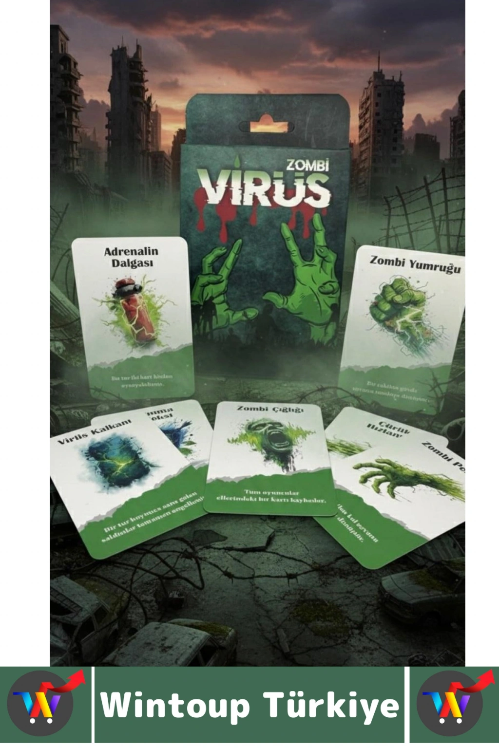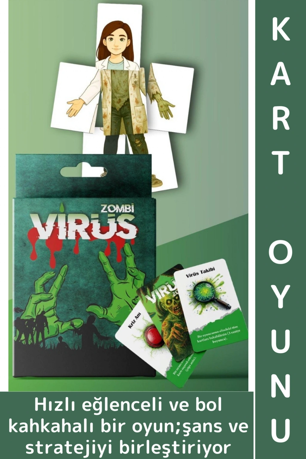 Zombi Virüs Kart Oyunu ile Heyecan Dolu Bir Maceraya Hazır Olun! Arkadaşlarınızla veya ailenizle vakit geçirmenin en eğlenceli yolu "Zombi Virüs" artık yanınızda! Bu strateji dolu kart oyununda amacınız, virüsten korunmak ve rakiplerinizi geride bırakarak hayatta kalan son kişi olmak. Görseldeki özel karakter tasarımıyla oyunun atmosferine kapılacak, "Virüs Takibi" ve "Kriz Anı" gibi aksiyon kartlarıyla oyunun gidişatını her an değiştirebileceksiniz.