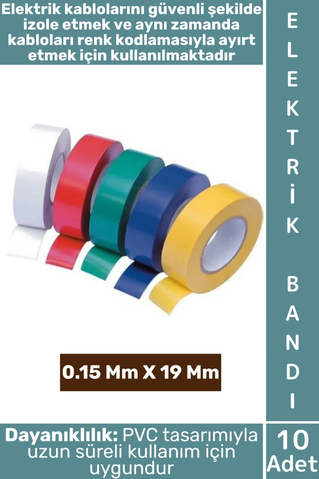 Elektrik kablolarını güvenli şekilde izole etmek ve aynı zamanda kabloları renk kodlamasıyla ayırt etmek için kullanılmaktadır. Dayanıklı PVC malzemeden üretilmiştir.