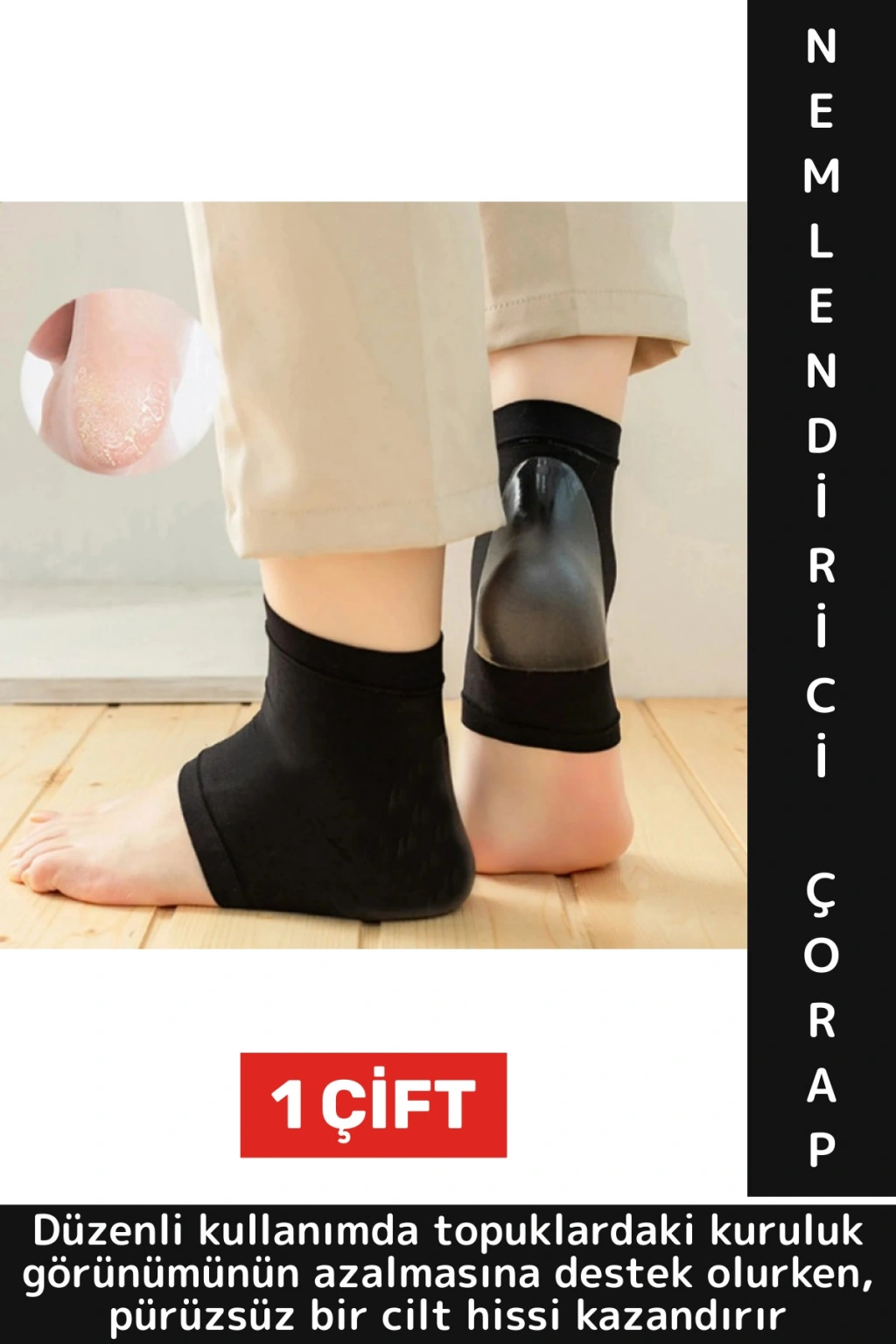 Siyah silikon topuk nemlendirici çorap, kuru, sertleşmiş ve çatlamaya meyilli topuklar için etkili bir bakım desteği sunmak amacıyla tasarlanmıştır. İç yüzeyinde yer alan silikon tabaka, nemi hapsederek topuk bölgesinin gün boyu yumuşak ve bakımlı kalmasına yardımcı olur.