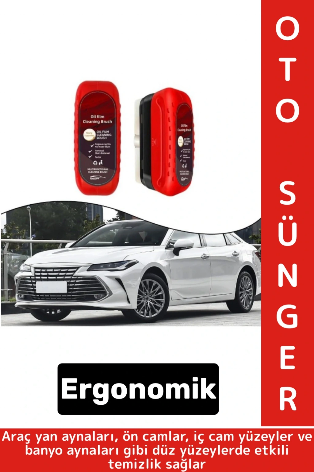 Araç yağ filmi temizleme süngeri, özellikle yağmur ve kir nedeniyle buğulanan veya yağlanan araç camları ve aynaları için geliştirilmiştir. Üst kısmında ergonomik plastik tutma sapı bulunur, alt kısmında ise özel temizlik pedi yer almaktadır. Araç yan aynaları, ön camlar, iç cam yüzeyler ve banyo aynaları gibi düz yüzeylerde etkili temizlik sağlar. Cam yüzeydeki yağ tabakalarını, sis ve buğu kalıntılarını kolayca giderir. Nemli şekilde kullanıldığında yüksek sağlar. Kompakt yapısı sayesinde araç içinde rahatlıkla saklanabilir. Ürün, sürüş güvenliğini artırmak için net görüş sağlamada yardımcı bir çözümdür. Temizlik sırasında cam yüzeye bastırılarak oval hareketlerle uygulanması önerilir.