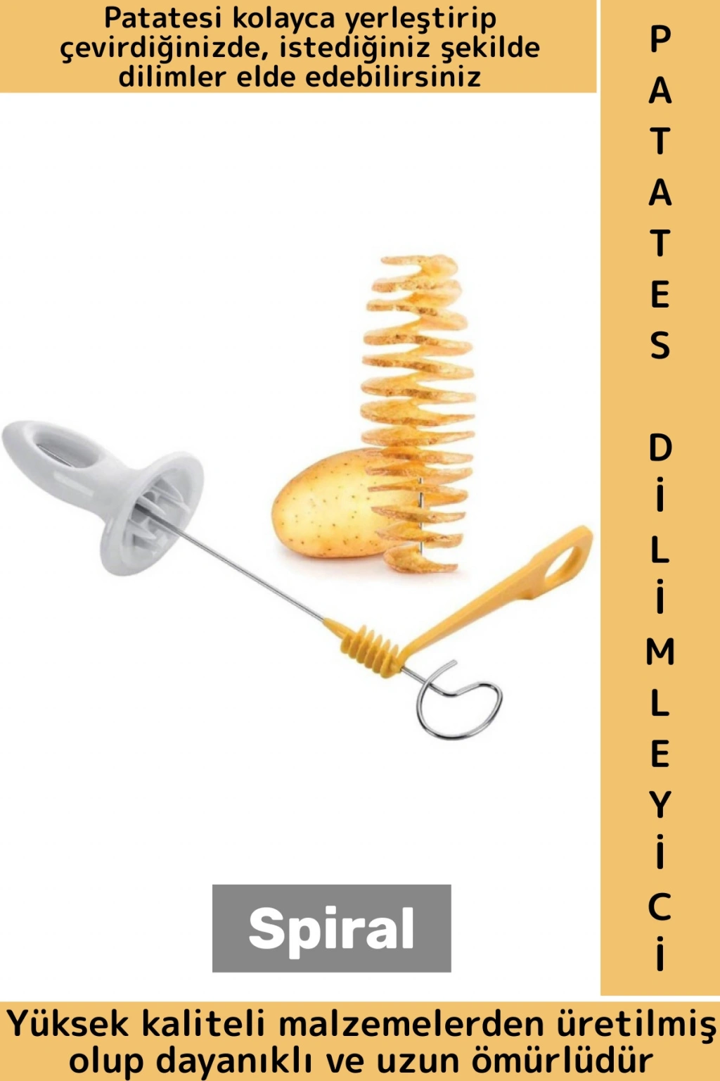 Spiral patates dilimleyici, patatesleri kolayca spiral şekilde kesmenizi sağlar. Kullanımı oldukça basit olan bu ürün, mutfakta eğlenceli ve pratik bir yardımcıdır. Yüksek kaliteli malzemelerden üretilmiş olup, dayanıklı ve uzun ömürlüdür. Patatesi kolayca yerleştirip çevirdiğinizde, istediğiniz şekilde dilimler elde edebilirsiniz. Bu araç, özellikle patates kızartması, garnitür veya atıştırmalıklar için mükemmel bir tercihtir.