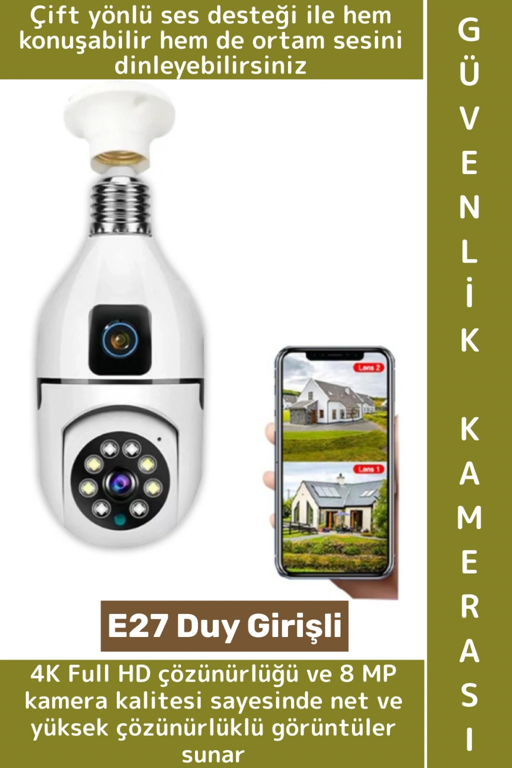 Çift lensli duy girişli kablosuz ampul kamera, pratik kurulumu ve gelişmiş güvenlik özellikleriyle dikkat çeker. E27 duy girişine kolayca monte edilerek ek adaptör gerektirmez. 4K Full HD çözünürlüğü ve 8 MP kamera kalitesi sayesinde net ve yüksek çözünürlüklü görüntüler sunar. 360° panoramik görüş açısı ile geniş alanları kapsar ve kör noktaları ortadan kaldırır.