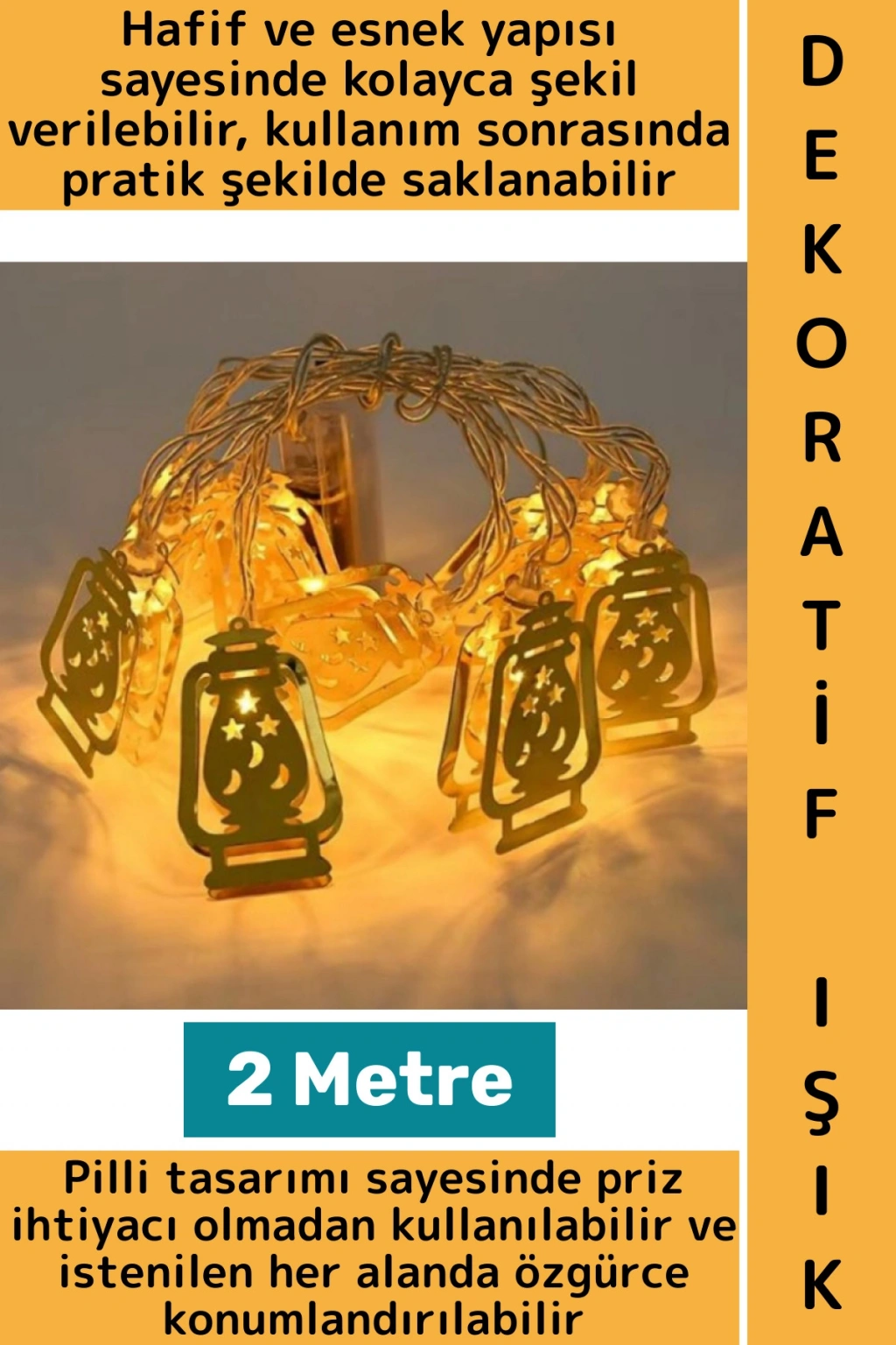 Pille çalışan yapısı sayesinde priz ihtiyacı olmadan her alanda özgürce kullanılabilir. Salon, yatak odası, balkon, pencere önü, masa üstü ve raf dekorasyonlarında şık bir tamamlayıcı olarak tercih edilebilir. Ramazan süslemeleri, özel gün dekorasyonları, kafe ve vitrin tasarımları için de oldukça uygundur. Esnek kablosu sayesinde kolayca şekil verilebilir, duvara, perdeye veya objelerin etrafına rahatlıkla sarılabilir. Hafif ve dayanıklı malzemeden üretilmiş olan bu dekoratif LED ışık, hem günlük dekorasyonda hem de dönemsel süslemelerde uzun süreli kullanım imkânı sunar.