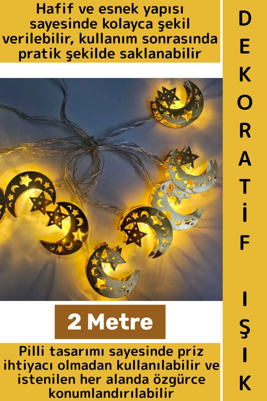 2 metre uzunluğa sahip LED ışık zinciri üzerinde yer alan gold metal ay ve yıldız figürleri, ışıklar yandığında ortama zarif ve huzurlu bir ambiyans kazandırır. Metal figürlerin gold rengi, özellikle akşam saatlerinde yanan LED ışıklarla birlikte dikkat çekici ve estetik bir görünüm sunar.