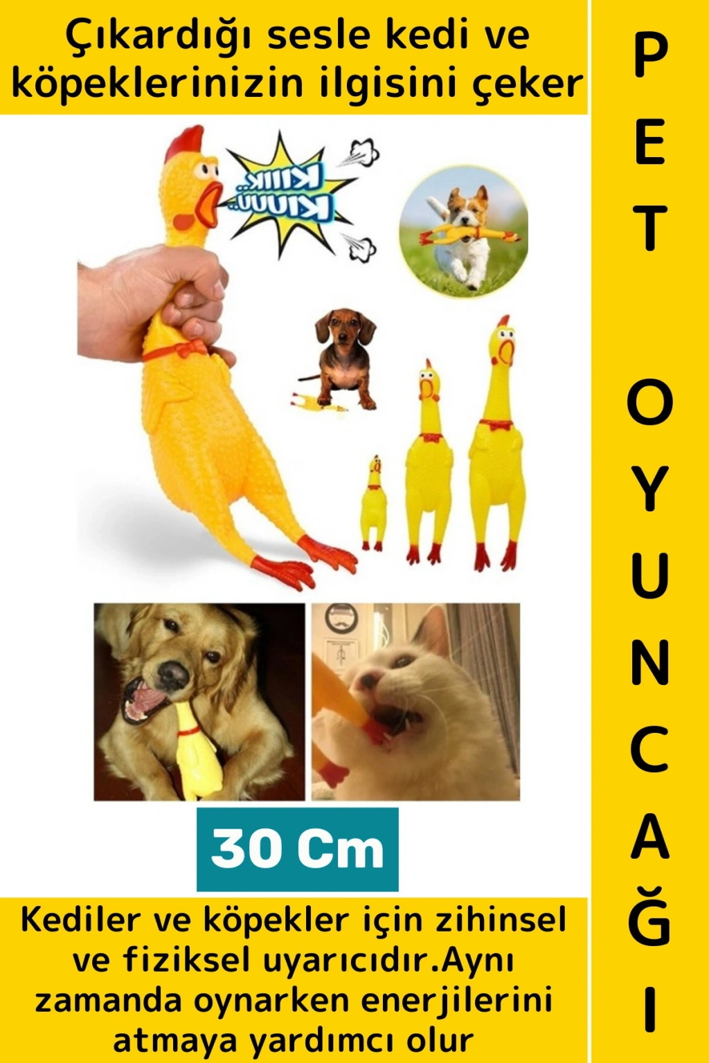 Ses çıkaran tavuk şeklinde kedi ve köpek oyuncakları, evcil hayvanların hem eğlenmesi hem de enerjilerini atması için tasarlanmıştır. Sıkıldığında veya üzerine basıldığında çıkardığı seslerle evcil hayvanlarınızın ilgisini çeker. Bu da hayvanların dikkatini çekerek oyuncağa ilgi göstermelerini sağlar.
