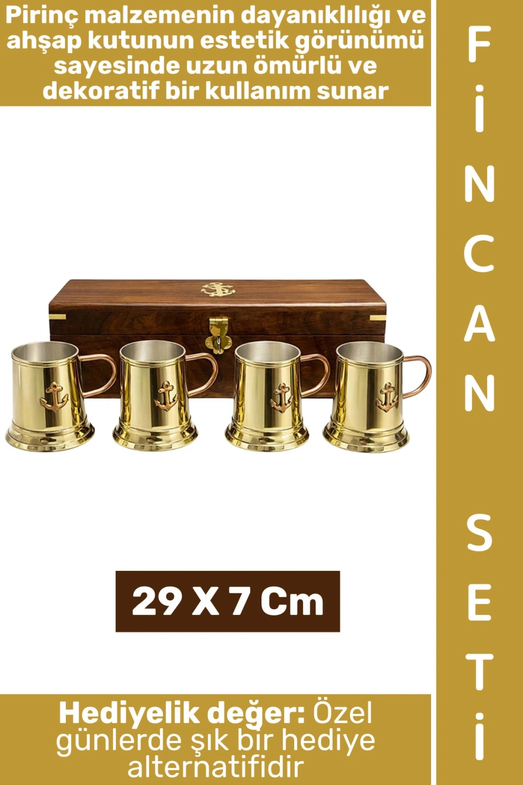 Hem hediyelik hem de özel sunum için tercih edilebilecek şık bir modeldir. Pirinç malzemenin dayanıklılığı ve ahşap kutunun estetik görünümü sayesinde uzun ömürlü ve dekoratif bir kullanım sunar.