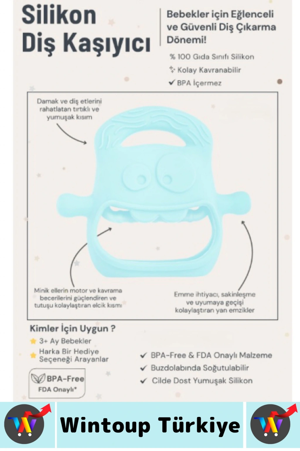 Bu özel diş kaşıyıcı sadece rahatlatıcı bir ürün değil; aynı zamanda motor ve duyusal gelişimi destekleyen bir oyun arkadaşıdır. Yumuşak silikon yüzeyleri sayesinde dokunsal keşfi teşvik eder. %100 gıda sınıfı silikon malzemeden üretilmiştir, BPA, BPS ve zararlı kimyasallar içermez. Yeni doğan döneminden itibaren güvenle kullanılabilir.