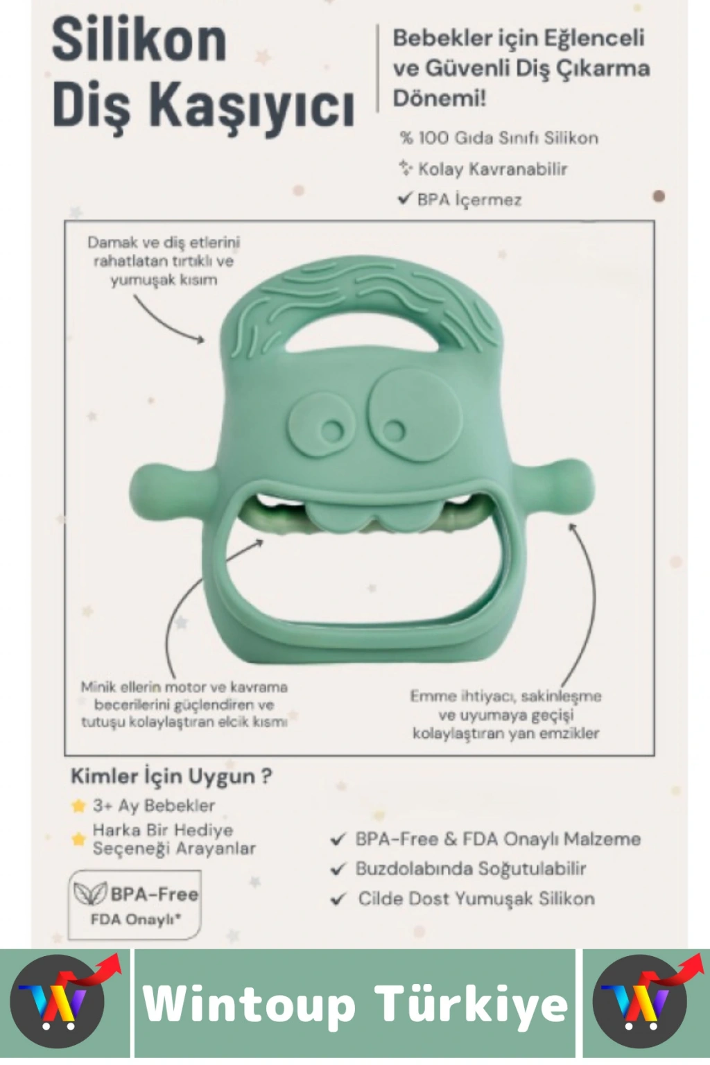 Bu özel diş kaşıyıcı sadece rahatlatıcı bir ürün değil; aynı zamanda motor ve duyusal gelişimi destekleyen bir oyun arkadaşıdır. Yumuşak silikon yüzeyleri sayesinde dokunsal keşfi teşvik eder. %100 gıda sınıfı silikon malzemeden üretilmiştir, BPA, BPS ve zararlı kimyasallar içermez. Yeni doğan döneminden itibaren güvenle kullanılabilir.