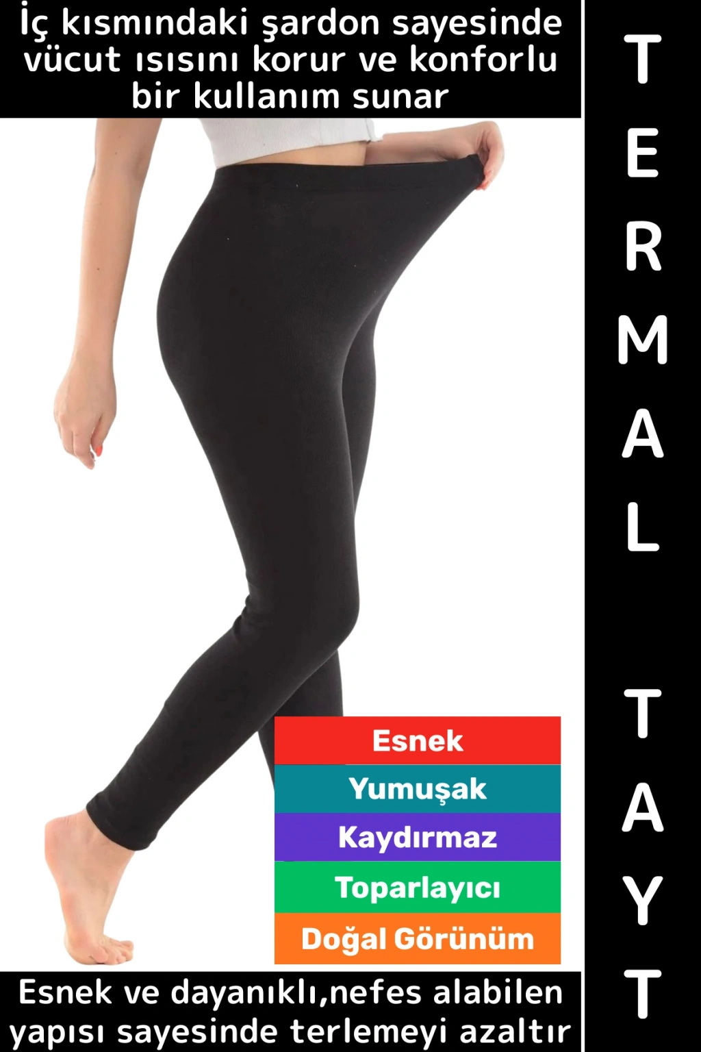 İçi şardonlu siyah termal tayt, soğuk havalarda sıcak tutmak için özel olarak tasarlanmış bir giyim ürünüdür. İç kısmındaki şardon (tüylendirilmiş, kadifemsi dokulu kumaş) sayesinde vücut ısısını korur ve konforlu bir kullanım sunar.