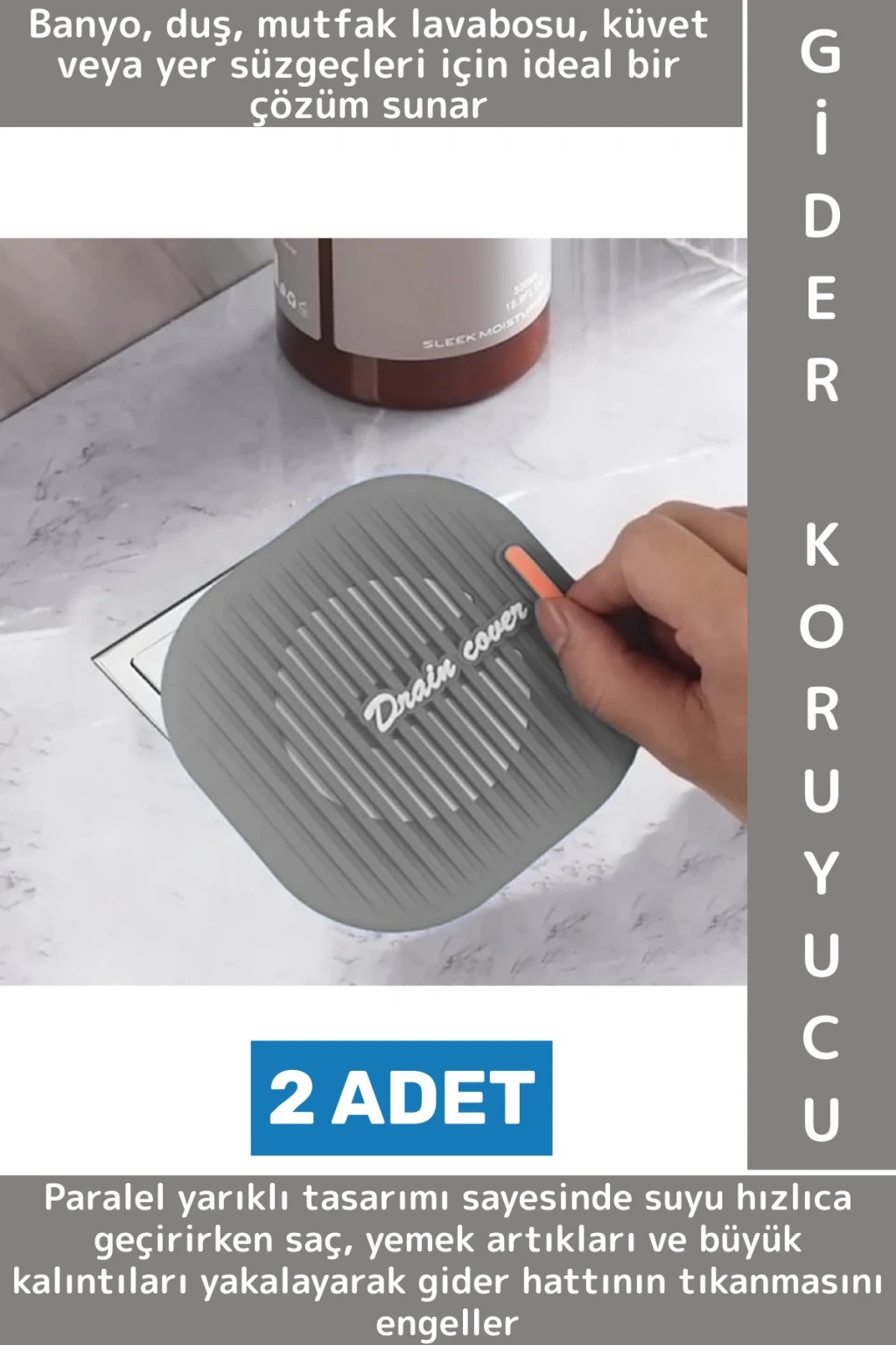 11.5 cm x 11.5 cm ölçülerindeki kare formu, standart gider ölçülerine mükemmel uyum sağlar. Paralel yarıklı tasarımı sayesinde suyu hızlıca geçirirken saç, yemek artıkları ve büyük kalıntıları yakalayarak gider hattının tıkanmasını engeller. Yüksek kaliteli esnek silikon malzemeden üretilmiş olup paslanma, küflenme veya deformasyon gibi sorunlara karşı dayanıklıdır.