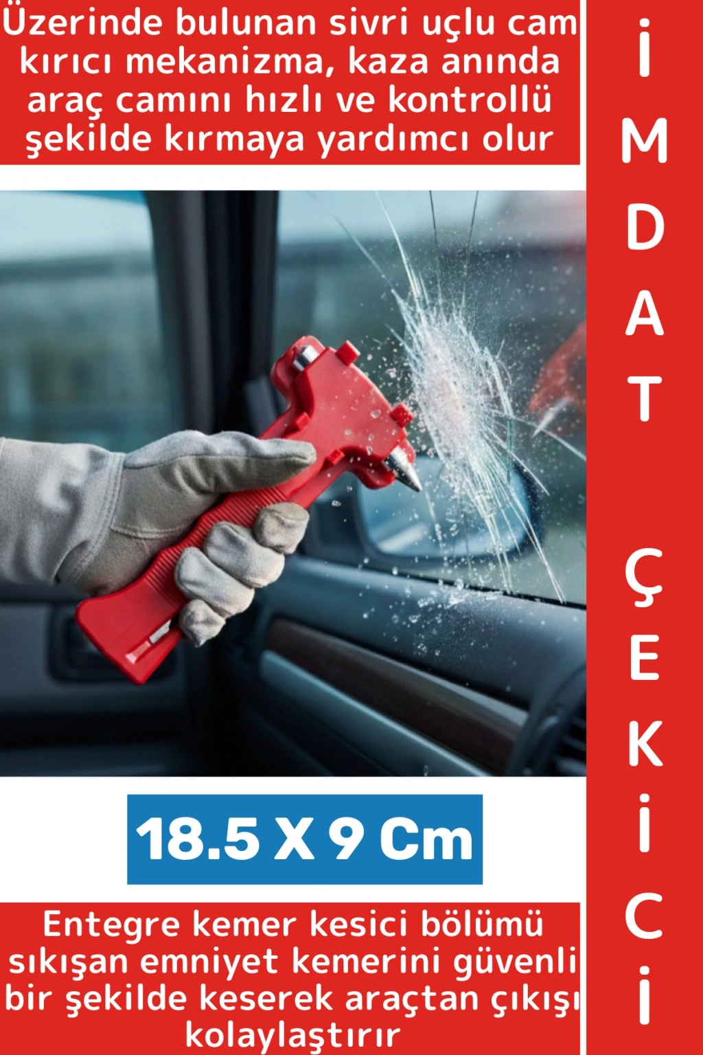 Araç içinde acil durumlar için tasarlanmış hayati bir güvenlik ekipmanıdır. Kompakt ve ergonomik yapısı sayesinde torpido gözünde, kapı cebinde veya kol dayama bölümünde kolayca saklanabilir. Üzerinde bulunan sivri uçlu cam kırıcı mekanizma, kaza anında araç camını hızlı ve kontrollü şekilde kırmaya yardımcı olur. Entegre kemer kesici bölümü ise sıkışan emniyet kemerini güvenli bir şekilde keserek araçtan çıkışı kolaylaştırır. Dayanıklı gövde yapısı ve elde kaymayı önleyen tasarımı sayesinde acil durumlarda hızlı müdahale imkânı sunar.