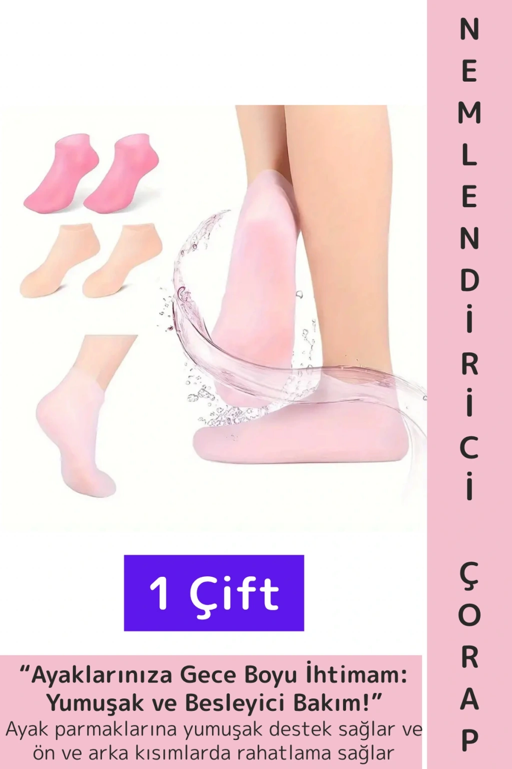 Silikon Jel Ayak Nemlendirici Çoraplar, ayaklarınıza gece boyunca nemlendirici ve rahatlatıcı bir bakım sunar. Nemlendirici çoraplar, ayak parmaklarına yumuşak destek sağlar ve ön ve arka kısımlarda rahatlama sağlar. Elastik ve deforme olması zor olan bu çoraplar, harika bir tasarım ve mükemmel işçilik sunar, sızdırmazlık sağlar ve besleyici özellikleriyle dikkat çeker. Silikon yapıdaki bu çorapları, ayak bakım jelini uyguladıktan sonra gece boyunca giyerek, jelin ayaklarınıza etkili bir şekilde nüfuz etmesini sağlayabilirsiniz. Kolay kullanımı ve çoğu kadın ayak ölçüsüne uyacak şekilde esnek yapısı ile pratik bir güzellik bakımı sunar.