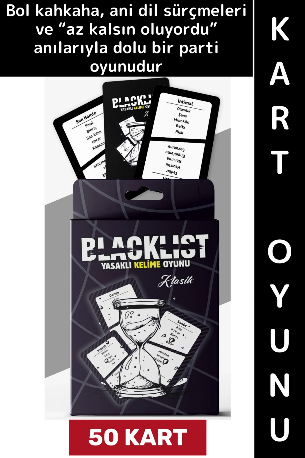 BLACKLIST,50 karttan oluşan hızlı, eğlenceli ve bol kahkahalı bir anlatma oyunudur. Her kartta bir hedef kelime ve o kelimeyi anlatırken asla kullanmaman gereken yasaklı kelimeler bulunur. Amacın, arkadaşlarına doğru kelimeyi buldurmak; ama ağzından kaçan tek bir kelime tüm turu anında yakabilir. Bu oyun; hızlı düşünmeyi, doğru kelimeyi doğru anda seçmeyi ve herkes sana bakarken cool kalmayı gerektirir. Süre akar, baskı artar, söylediğin her kelime potansiyel bir risk olur.