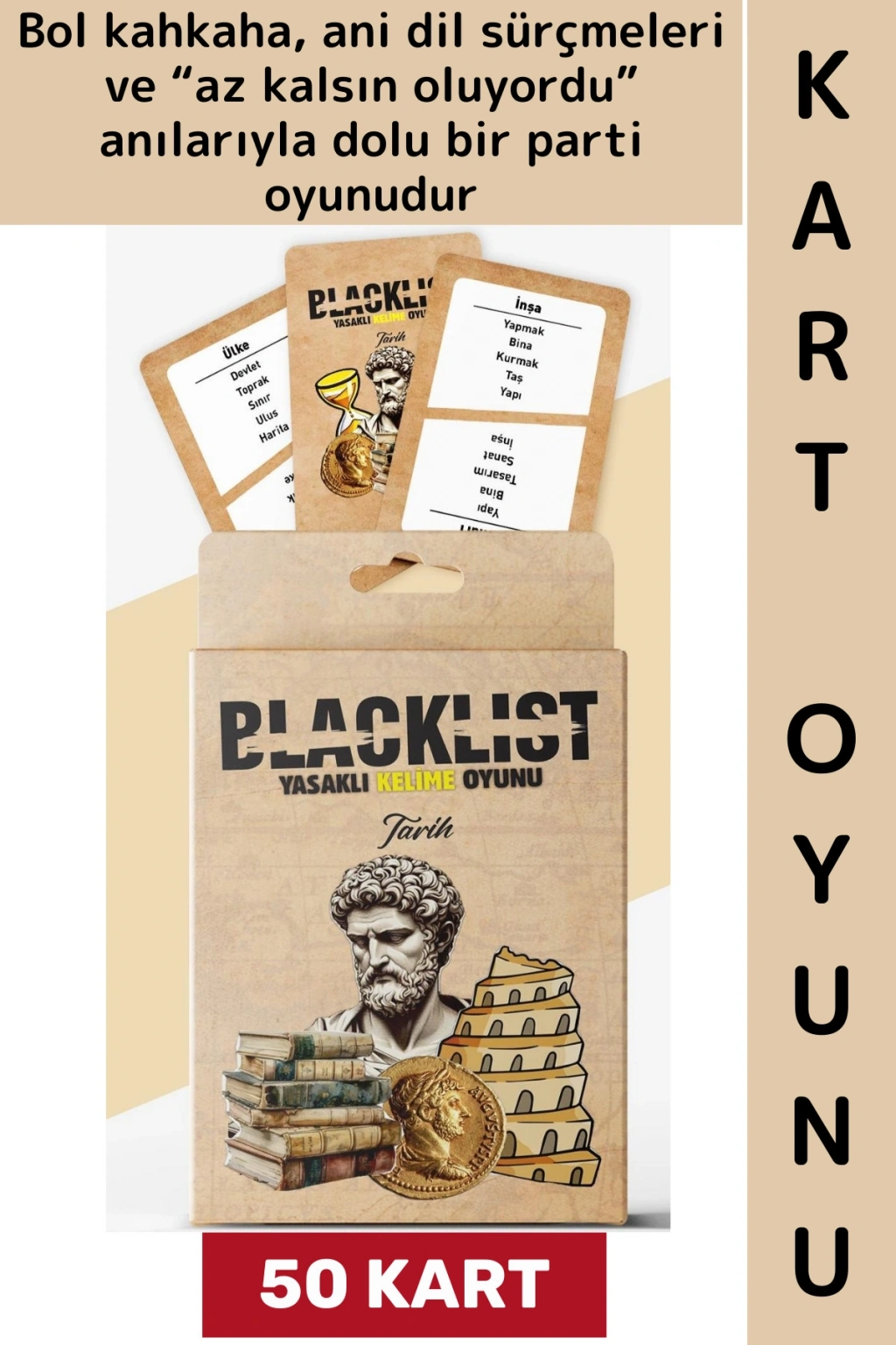 BLACKLIST, 50 karttan oluşan hızlı, eğlenceli ve düşündüren bir anlatma oyunudur. Her kartta tarih boyunca karşımıza çıkan bir hedef kelime ve bu kelimeyi anlatırken kesinlikle kullanmaman gereken yasaklı kelimeler yer alır. Amacın, takım arkadaşlarına doğru kelimeyi buldurmak; ancak ağzından kaçan tek bir kelime tüm turu riske atabilir.