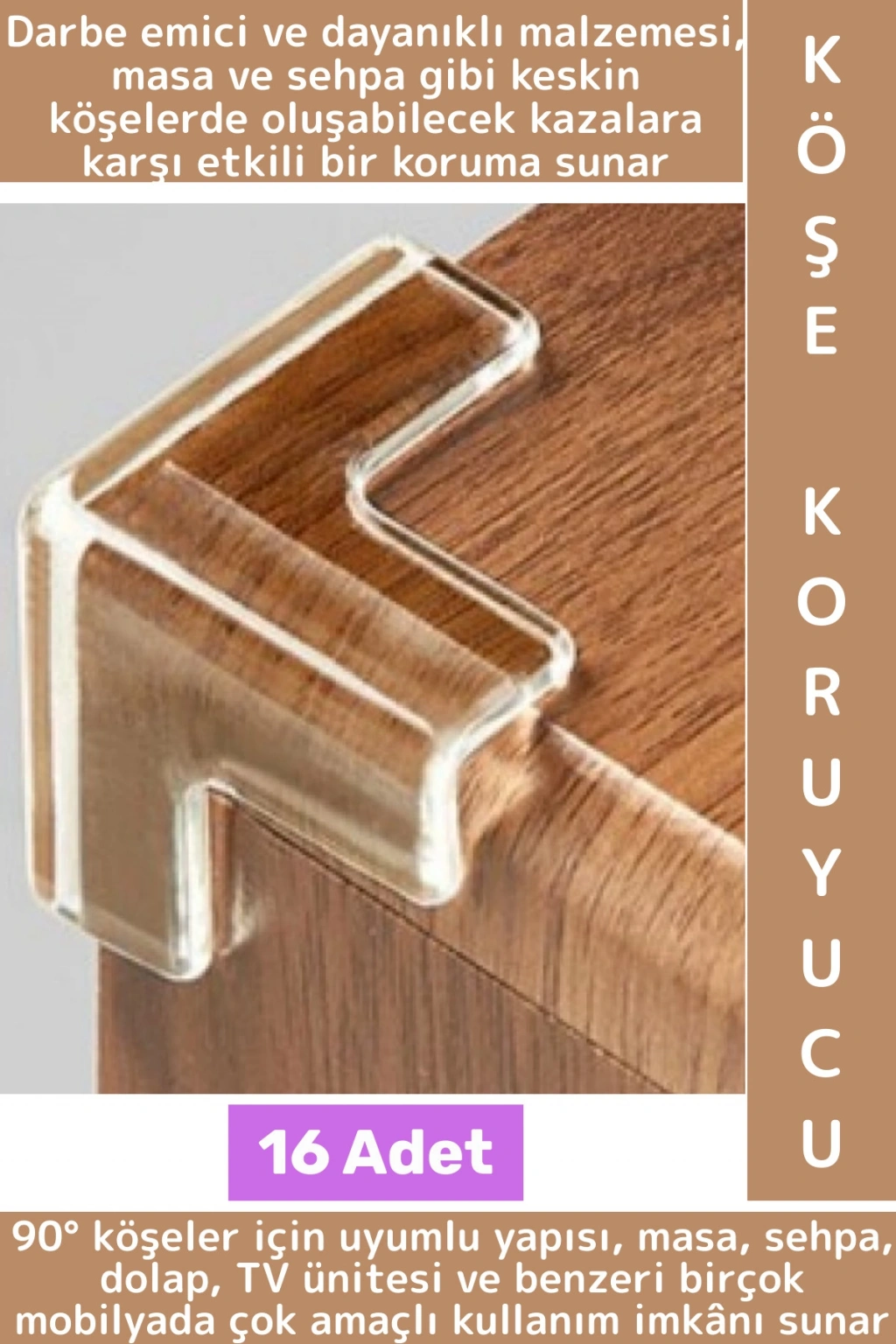 90° köşeler için uyumlu yapısı, masa, sehpa, dolap, TV ünitesi ve benzeri birçok mobilyada çok amaçlı kullanım imkânı sunar. Çocuklu aileler için güvenli bir ortam oluşturmaya yardımcı olurken, ofis ve ev kullanımında da düzenli ve korunaklı bir alan sağlar.
