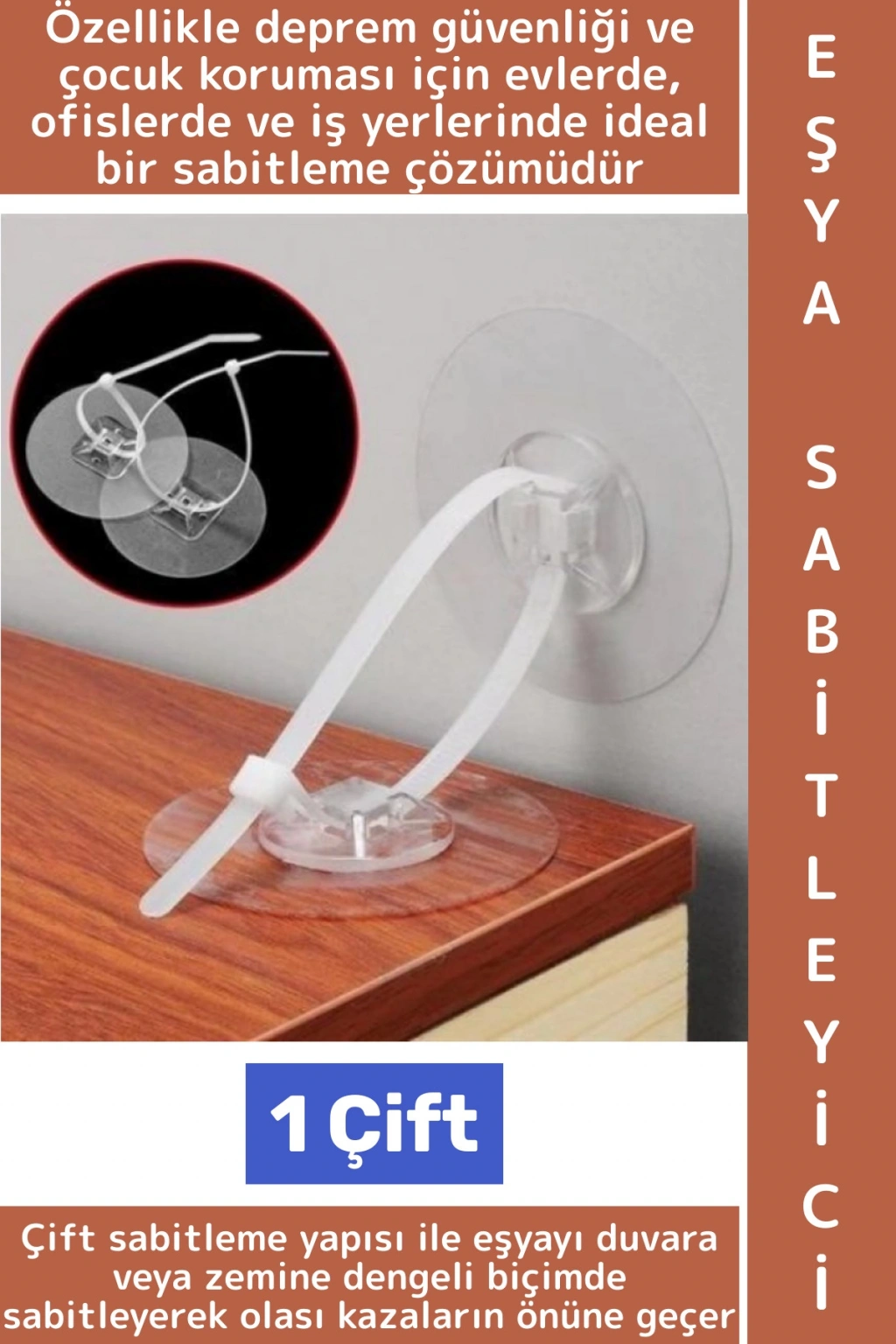 İhtiyaç halinde, üzerindeki vida delikleri sayesinde vidalama yapılarak ekstra sağlamlık da sağlanabilir. Özellikle deprem güvenliği ve çocuk koruması için evlerde, ofislerde ve iş yerlerinde ideal bir sabitleme çözümüdür.
